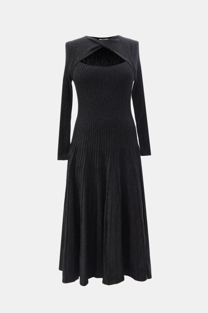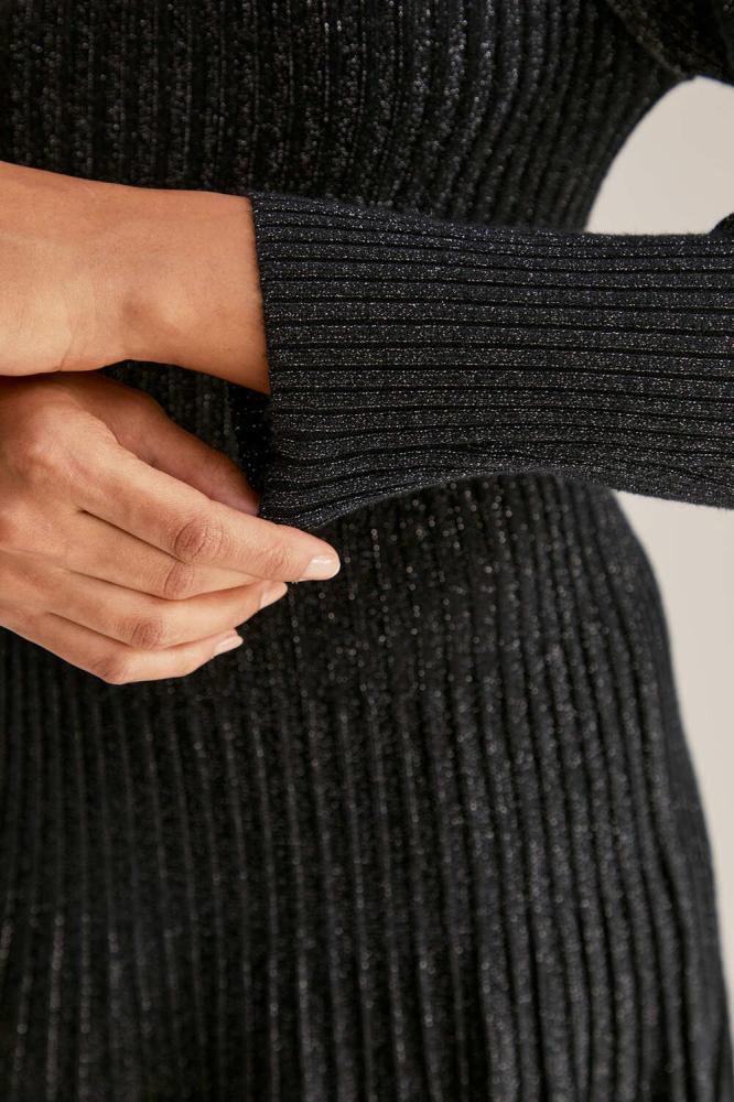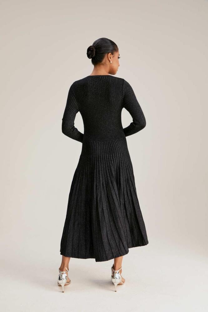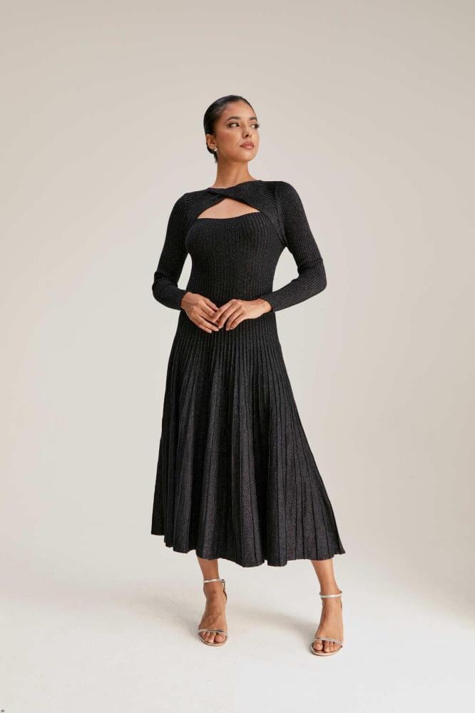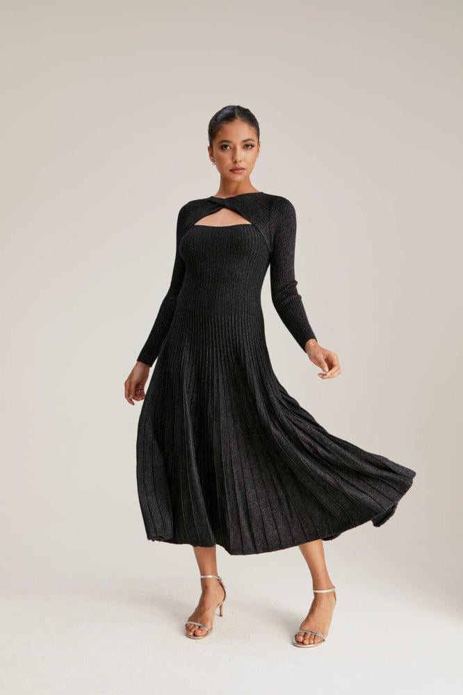 جددي مظهرك في موسم الشتاء مع هذا الفستان الناعم. مصنوع من خامة محبوكة بلمسات لامعة ، بياقة مستديرة مزينة بفتحة وبأكمام طويلة ويأتي بقصة على شكل حرف A.
