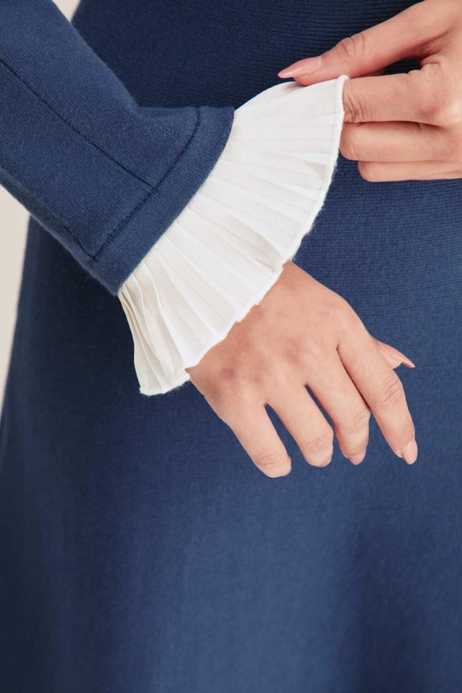 أكمامه الطويلة مزينة بحواف كشكش تضيف لمسة من الرقة والأنوثة.