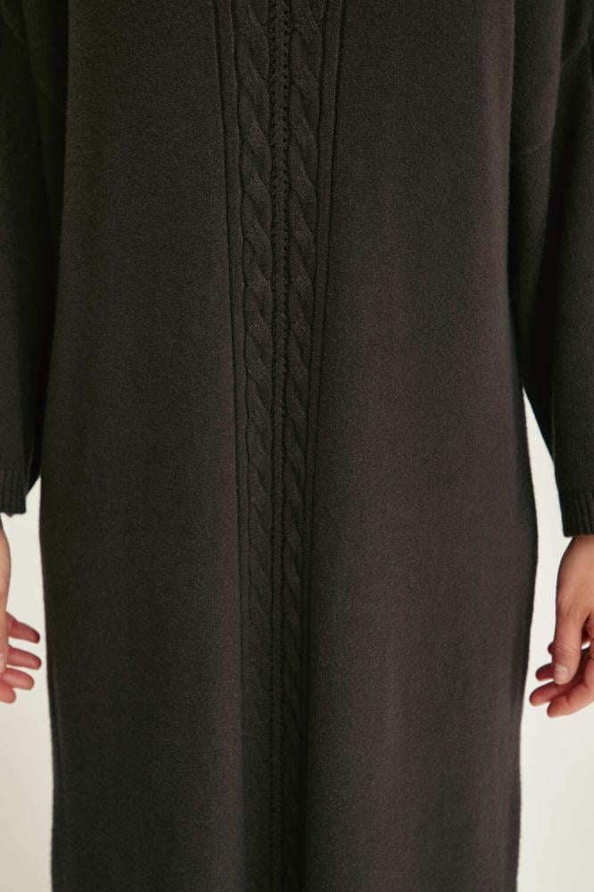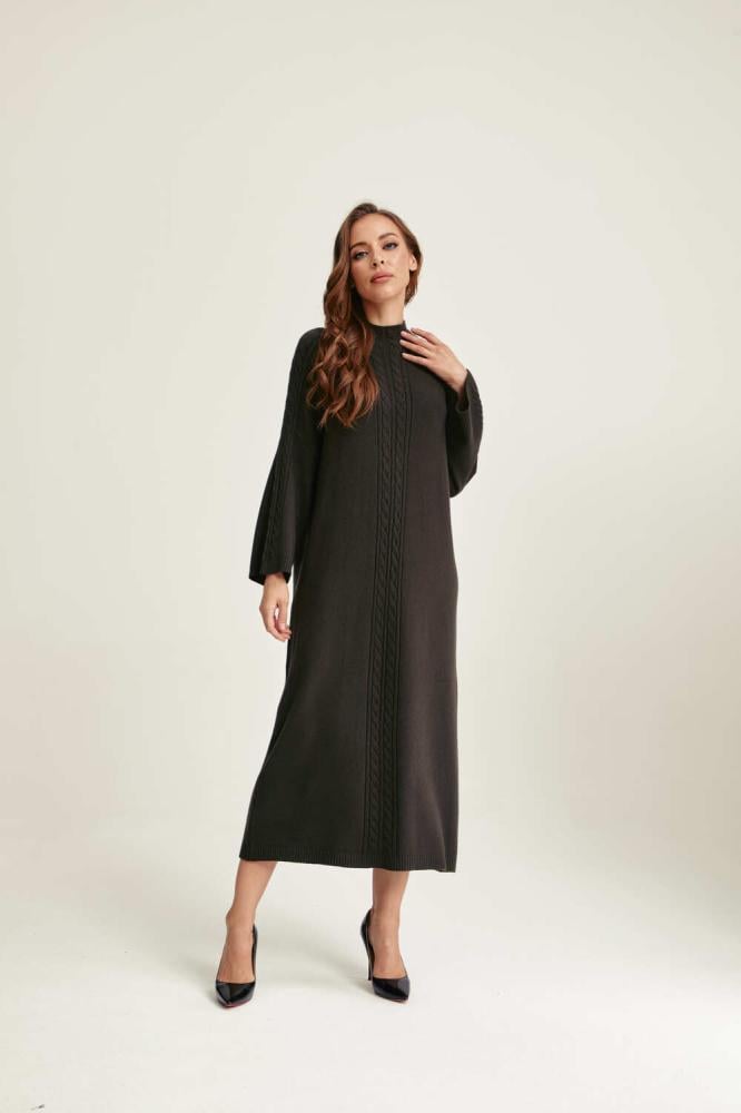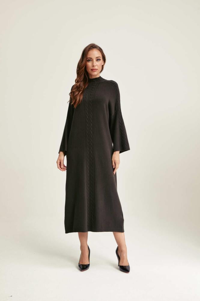 احصلي على إطلالة أنيقة في الأجواء الباردة فستان بتصميم بقصة واسعة يتميز بياقة عالية وأكمام طويلة . نسقيه مع حزام جلد وحذاء بوت بنعل سميك.