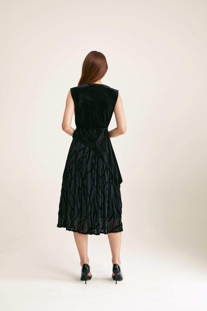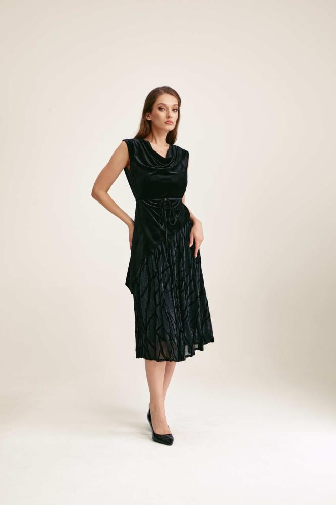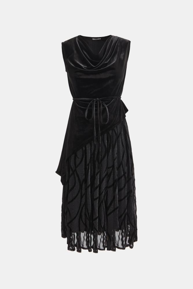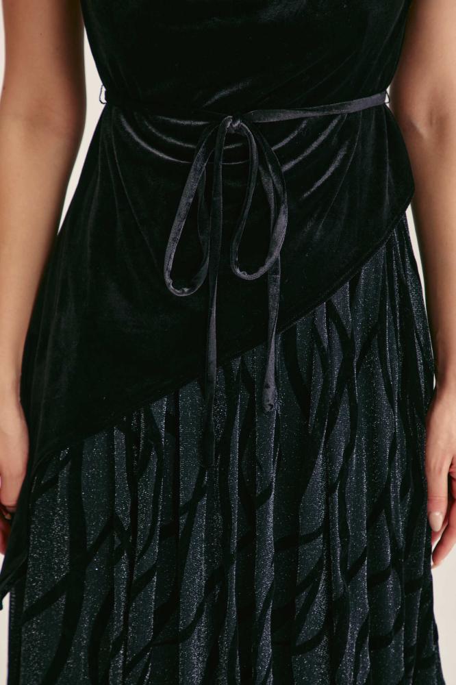 فستان بتصميم قطعتين، يتميز ببلوزة بياقة مخمل متدلية لمظهر راقٍ وانسيابي. وبقصة غير متماثلة بحزام ربط يضيف لمسة عصرية جذابة. وفستان بطيات ناعمة وخامة لامعة مخملية ، مما يمنحك لمسة فخامة وانسيابية مثالية للمناسبات الخاصة.