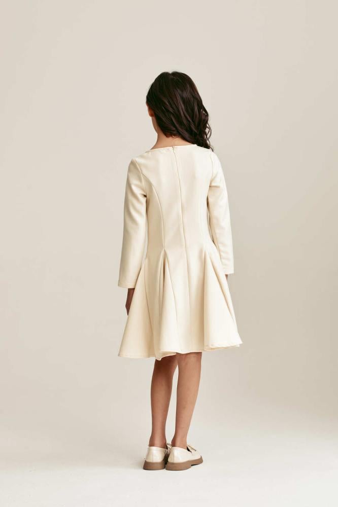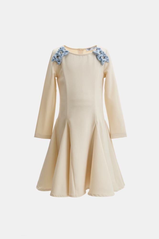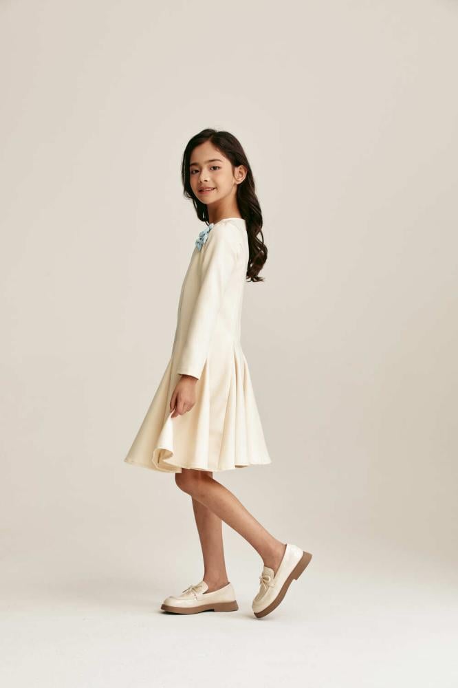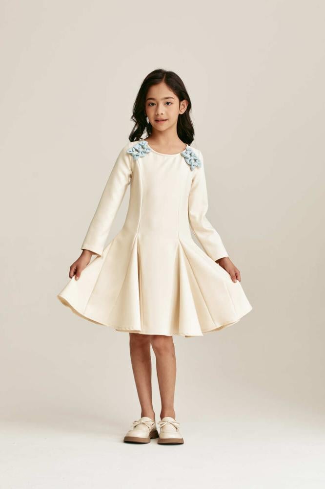 فستان كريمي ناعم بتصميم ميدي يمنح صغيرتك إطلالة راقية ومفعمة بالبراءة. يتميز بقصة واسعة تتمايل مع الحركة وتفاصيل زهرية زرقاء على الكتفين. قطعة مثالية للمناسبات تضيف لمسة أنثوية أنيقة وأسلوب عصري فريد.