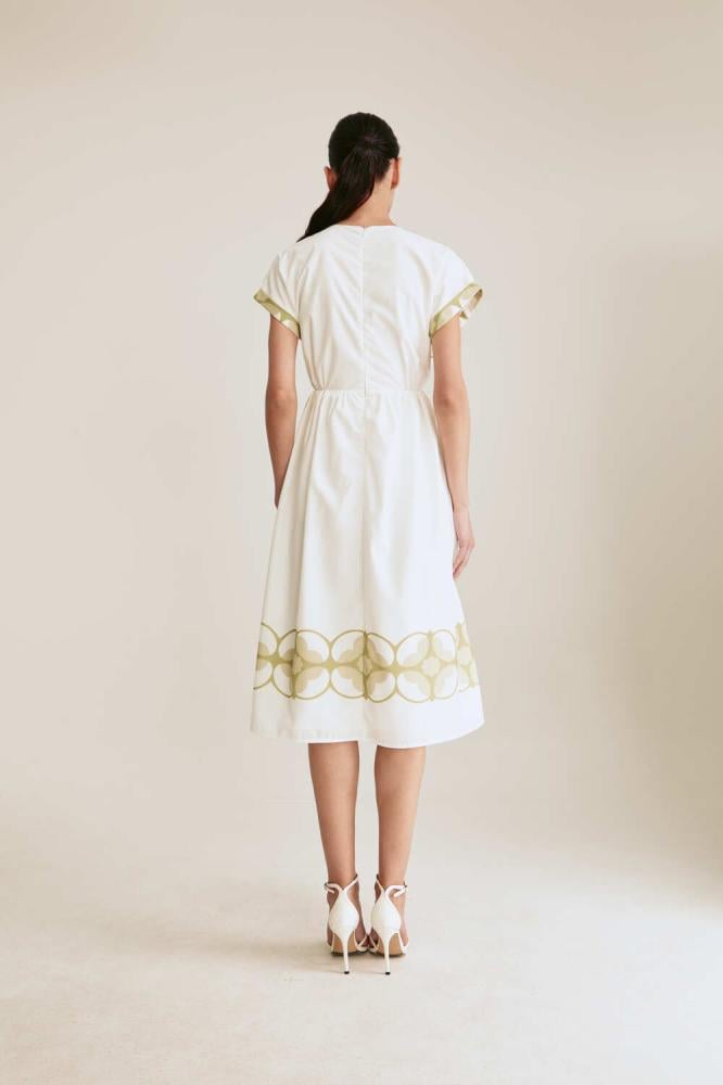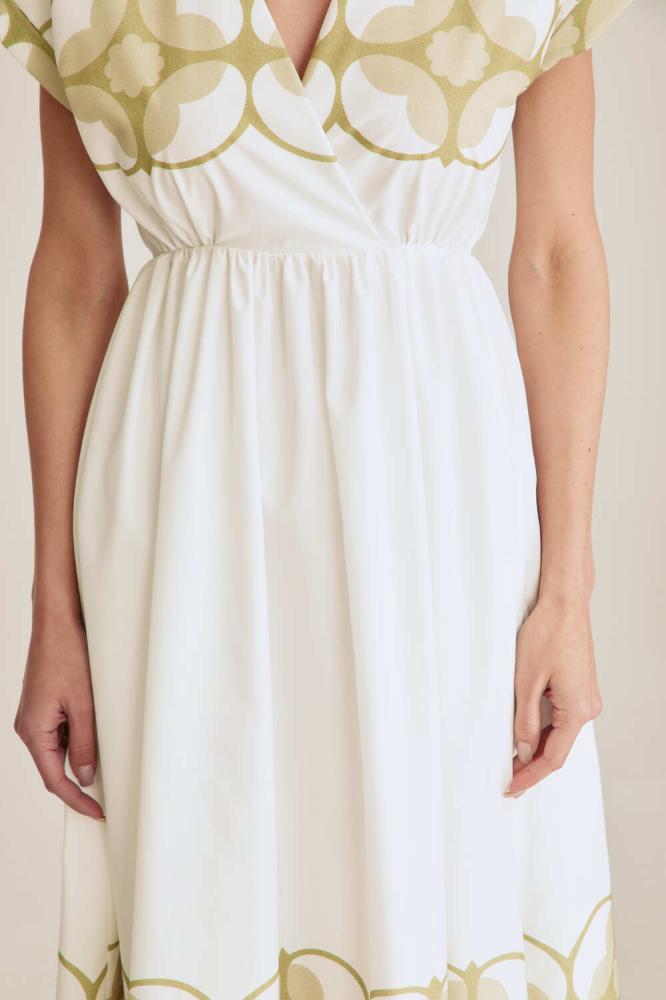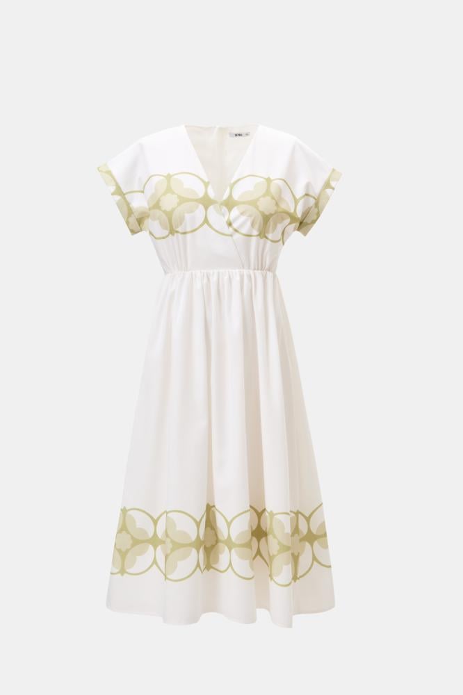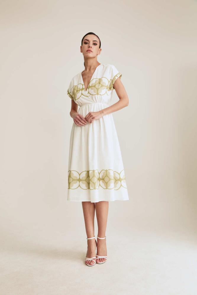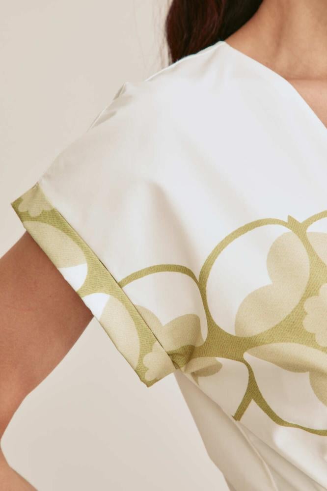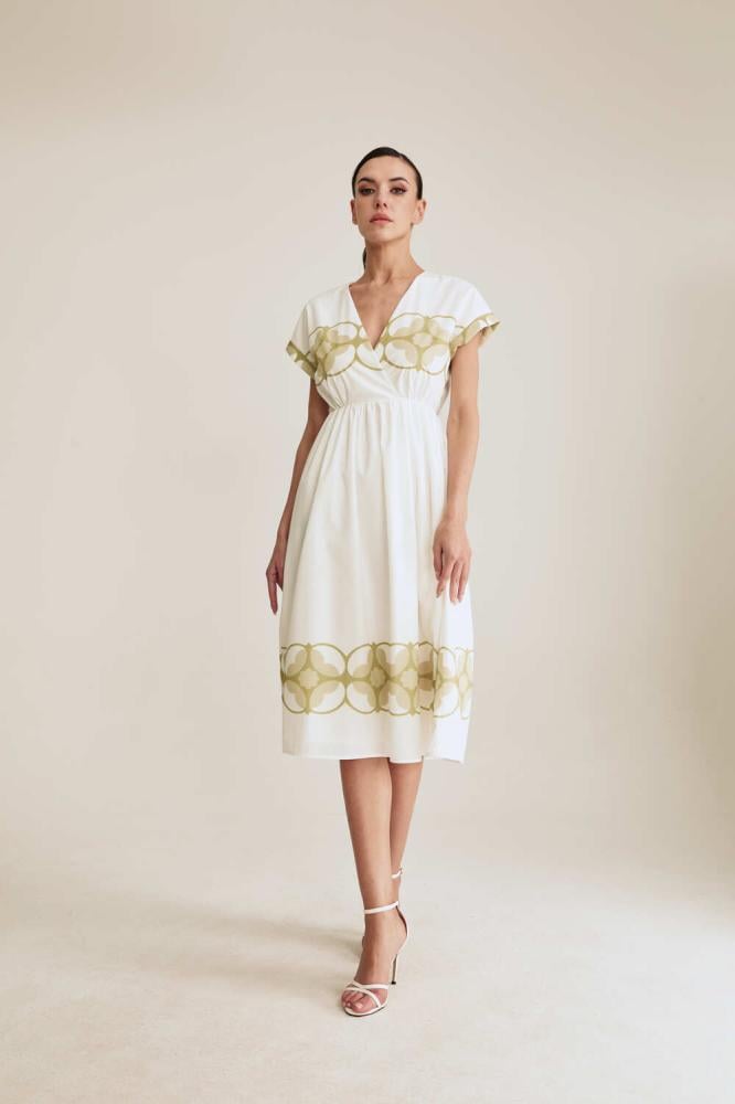 تصميم ناعم يفيض أنوثة. فستان مزين بنقوش ورود كبيرة ، بياقة لف وأكمام قصيرة ، يأتي بخصر مطاطي يبرز القوام برقي وانسيابية. خيار مثالي للإطلالات اليومية والمناسبات الخفيفة.