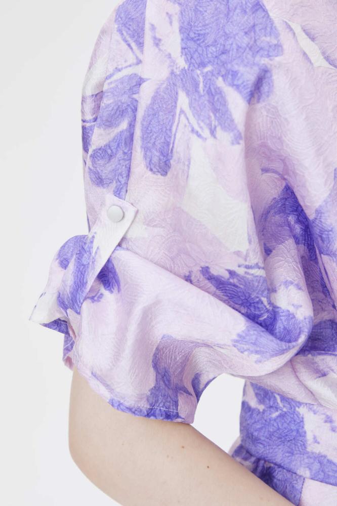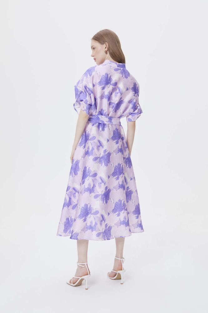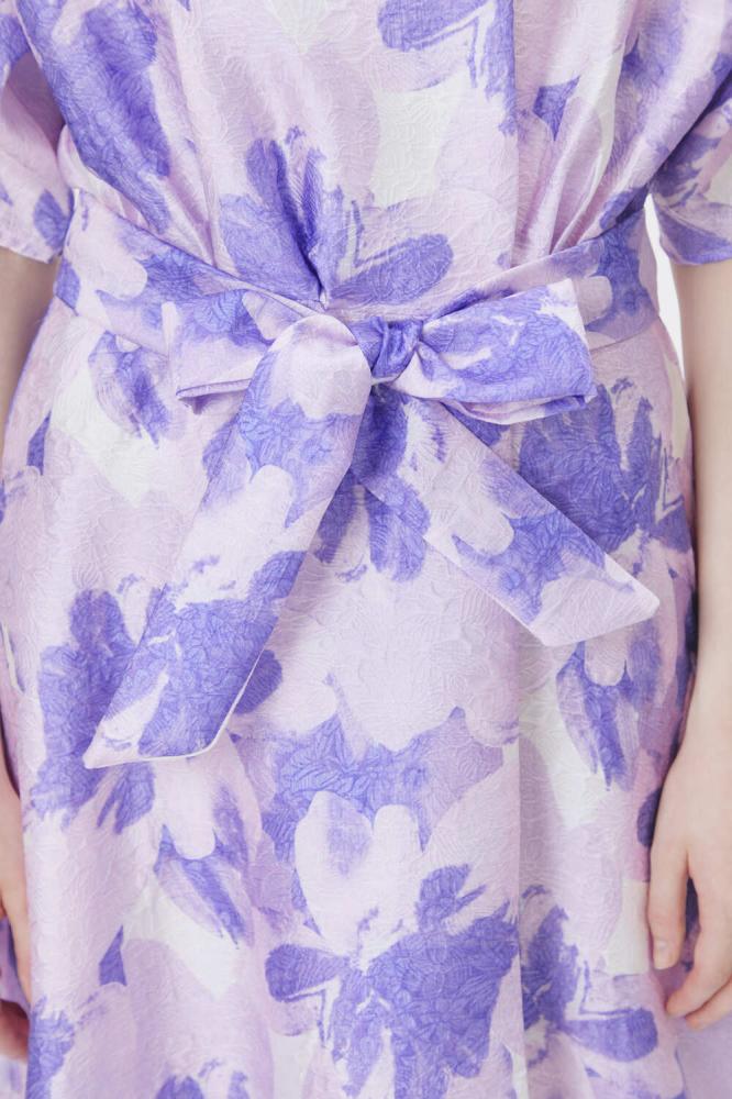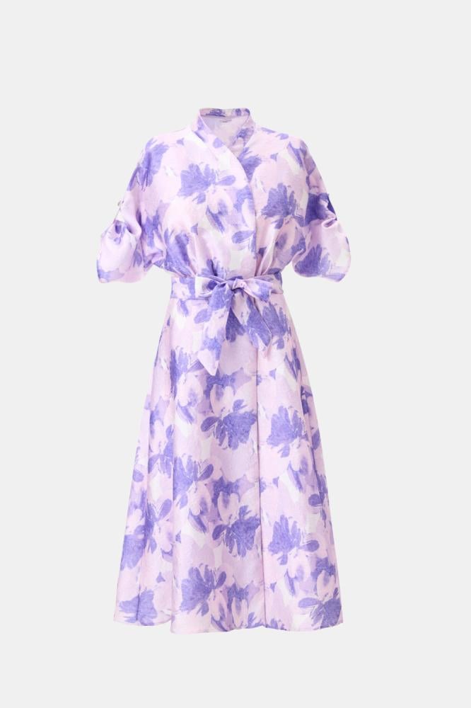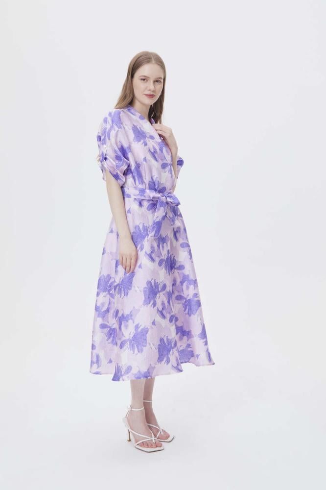 فستان بنمط لف مزين بنقوش موردة تضفي عليه لمسة ناعمة وحالمة. يتميز بحزام ربط ، مع أكمام قابلة للتعديل ، يأتي بقصة على شكل حرف A ، مما يمنحك إطلالة انسيابية تناسب مختلف المناسبات.