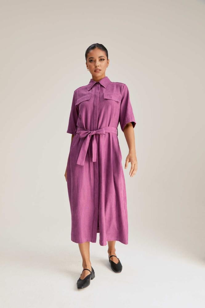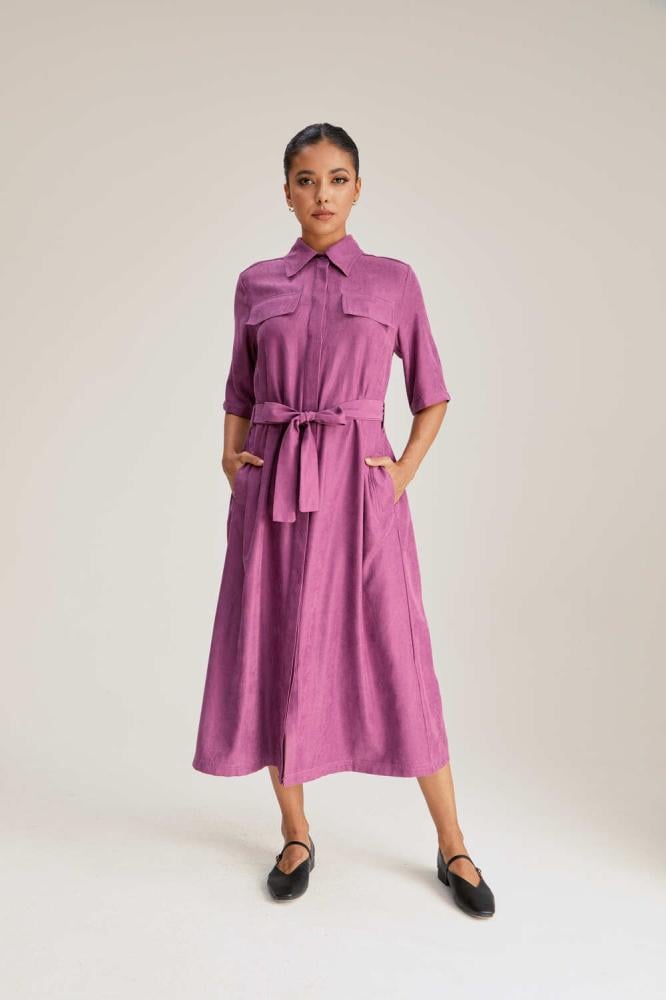 أبرزي أنوثتك بإطلالة عصرية مع فستان بنمط قميص بأزرار مخفية للإغلاق ،بتصميم مريح وأنيق. تفصيل الجيوب الأمامية تضيف لمسة عملية، بينما حزام الخصر يحدد القوام بأسلوب ناعم. قطعة مثالية للنهارلتمنحك حضورًا راقيًا.