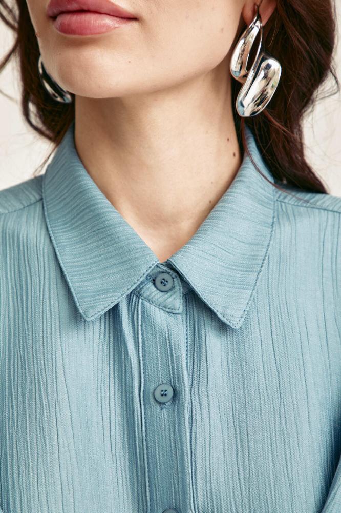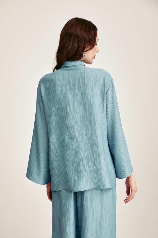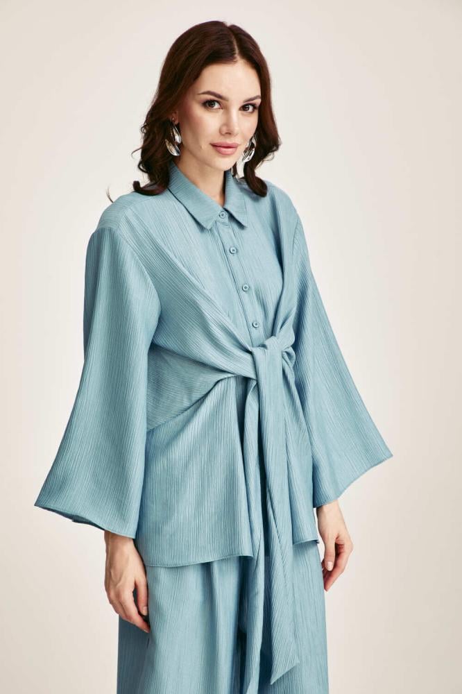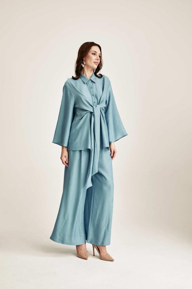 قميص بياقة مدببة وقصة واسعة، مزين بربطة من الأمام ، ويأتي مع بنطلون مماثل لإطلالة متناسقة. خيار مثالي لمظهر عملي أنيق ، يجمع بين الراحة والتنسيق العصري.