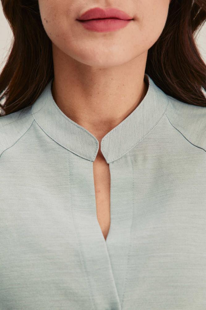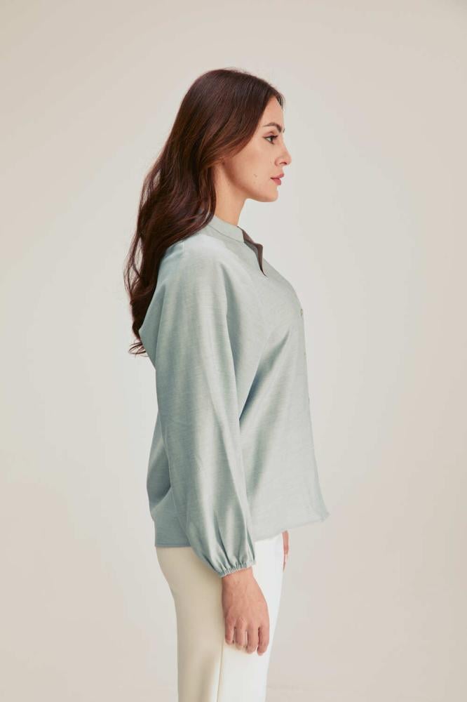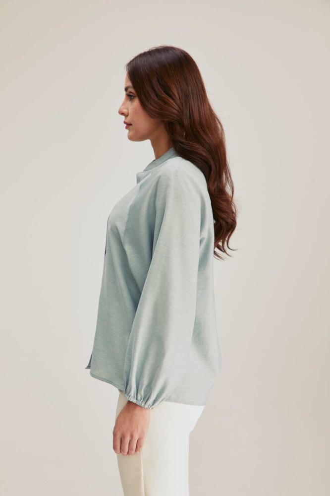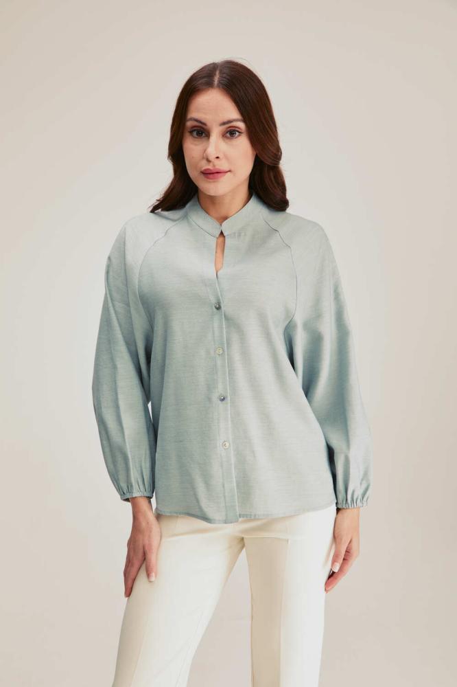 أكملي أناقة إطلالتك مع هذا القميص بتصميم كلاسيكي سهل الارتداء بياقة ماندارين وأزرار أمامية وأساور مطاطية . كما يأتي بقصة فضفاضة مريحة مناسبة لإطلالتك في العمل