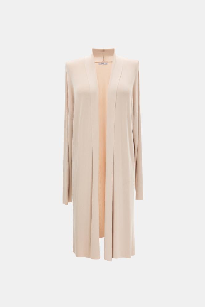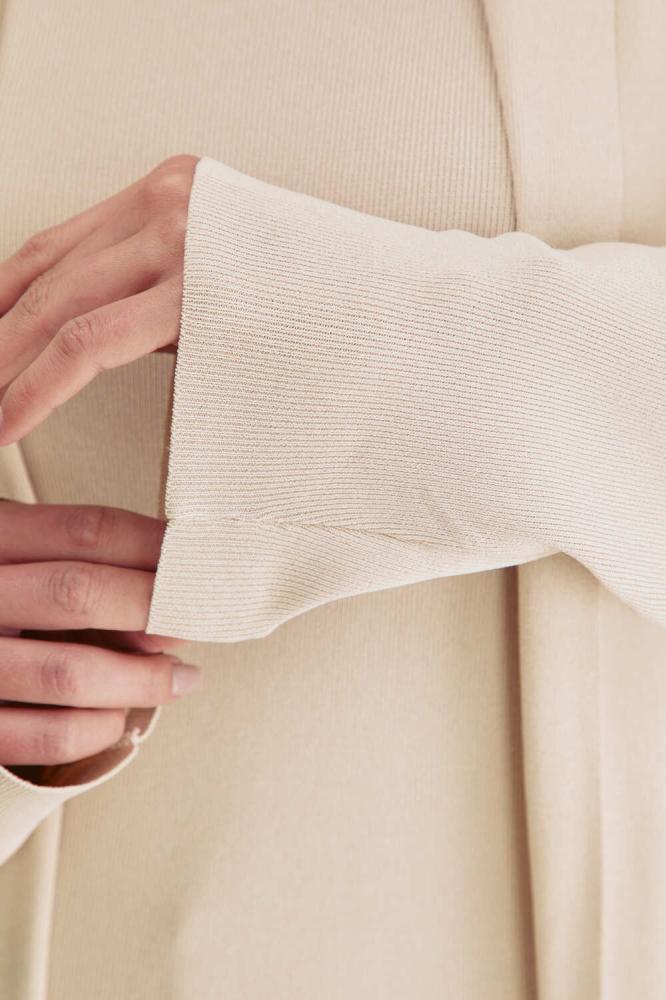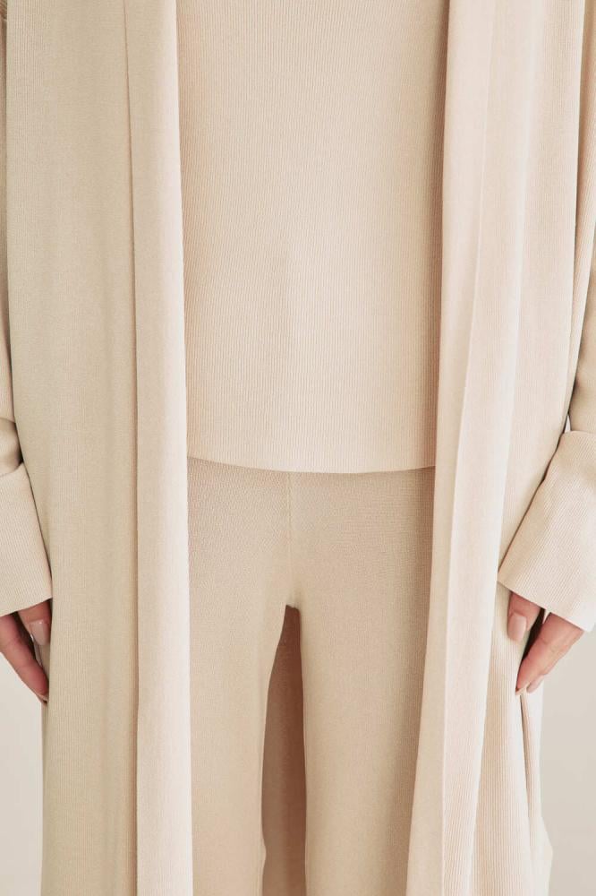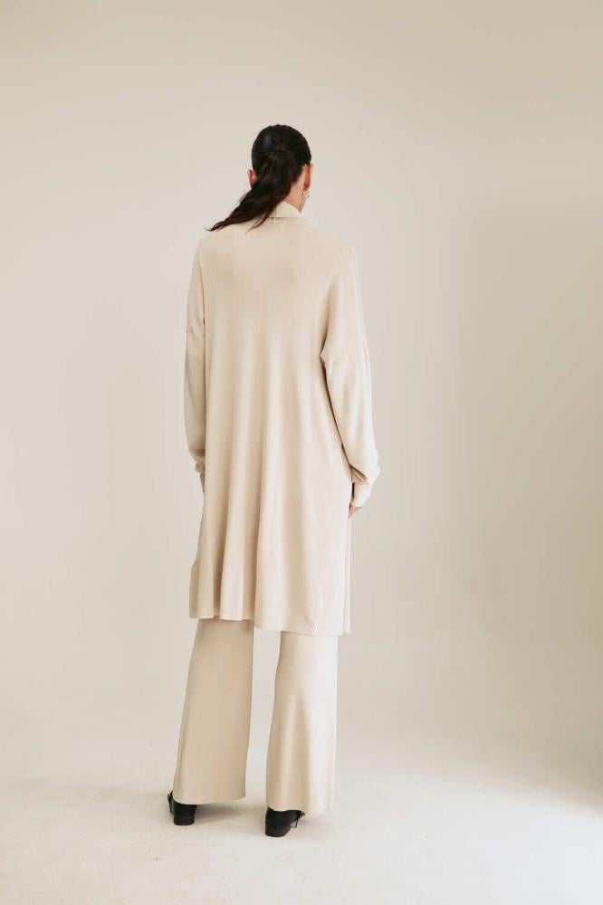 تألقي بإطلالة محتشمة راقية بكارديغان بتصميم بأكمام منسدلة وبقصة مفتوحة من الأمام ، نسقية مع بلوزة وبنطلون واسع لإطلالة عصرية