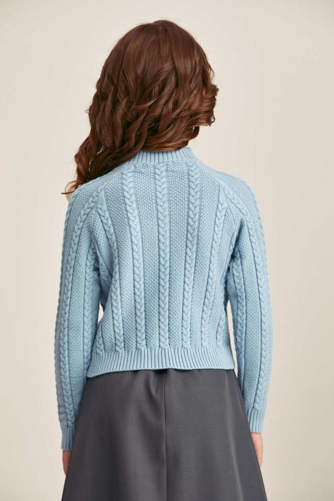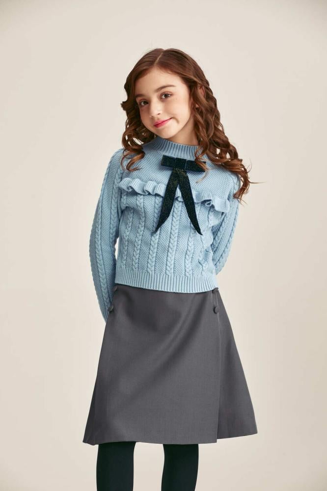 كنزة بناتي بياقة عالية مزينة بكشكش أنيق وربطة لامعة من الأمام تضيف لمسة ساحرة لصغيرتك. تصميمها العصري يجعلها مثالية للإطلالات اليومية والمناسبات الخاصة. نسقيها مع تنورة مماثلة لإطلالة متكاملة ومميزة.