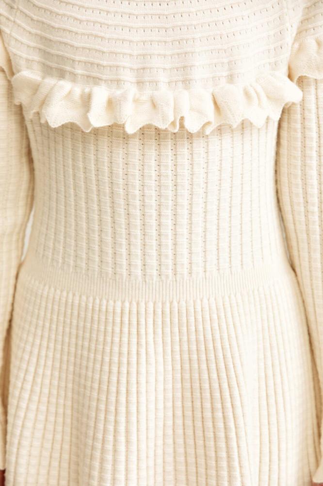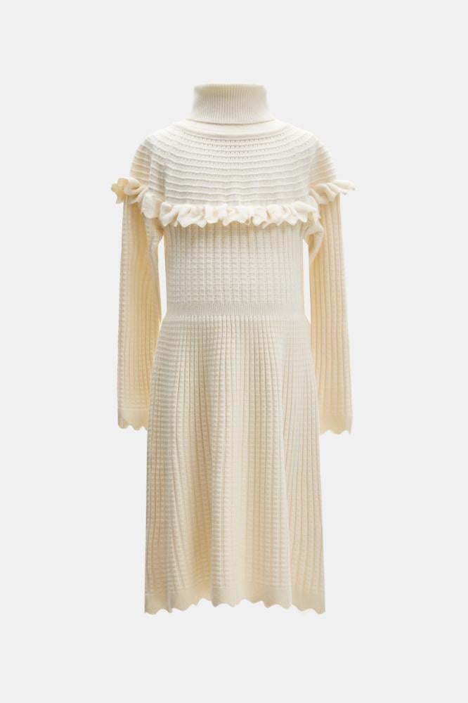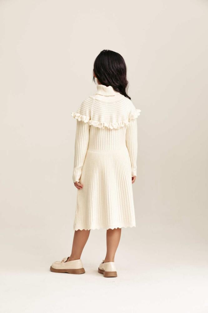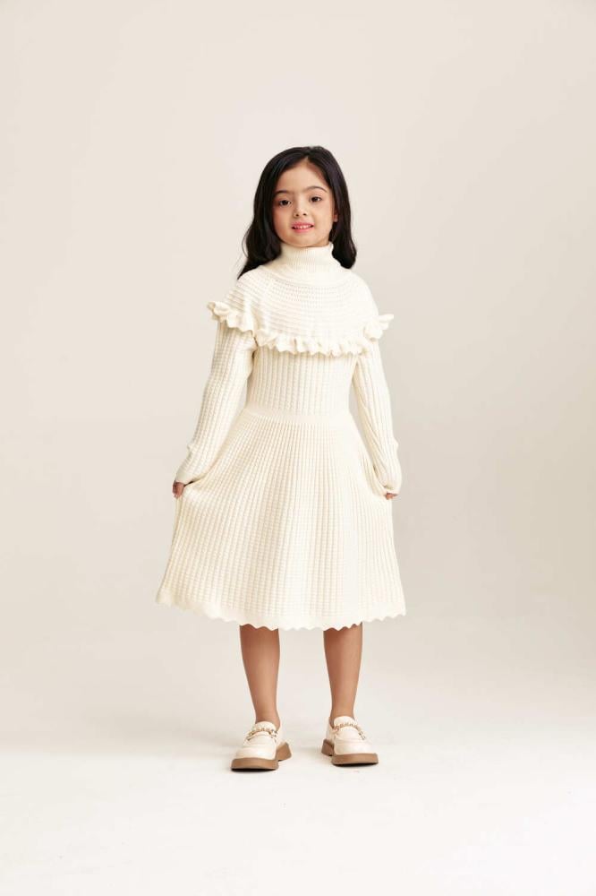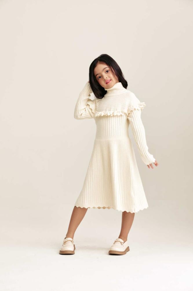 فستان محبوك بأكمام طويلة بتصميم انسيابي يعكس دفء الشتاء برونق عصري. يتميز بياقة عالية وبتفاصيل كشكش تضيف لمسة رقي ناعمة. قصة ميدي واسعة تمنح صغيرتك إطلالة عملية ومريحة طوال اليوم.