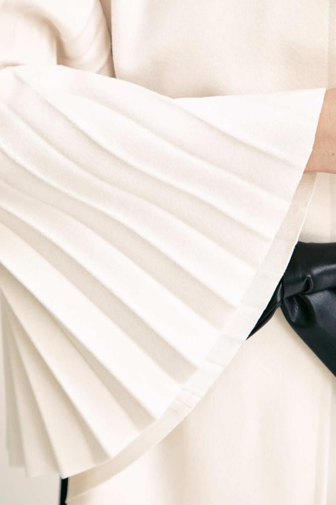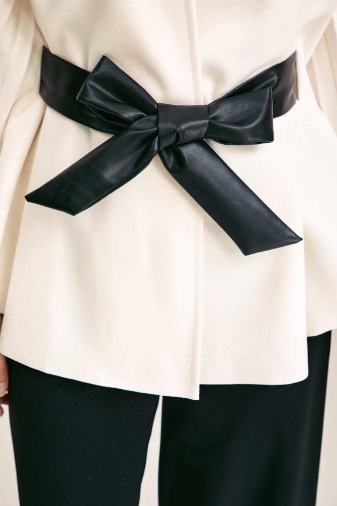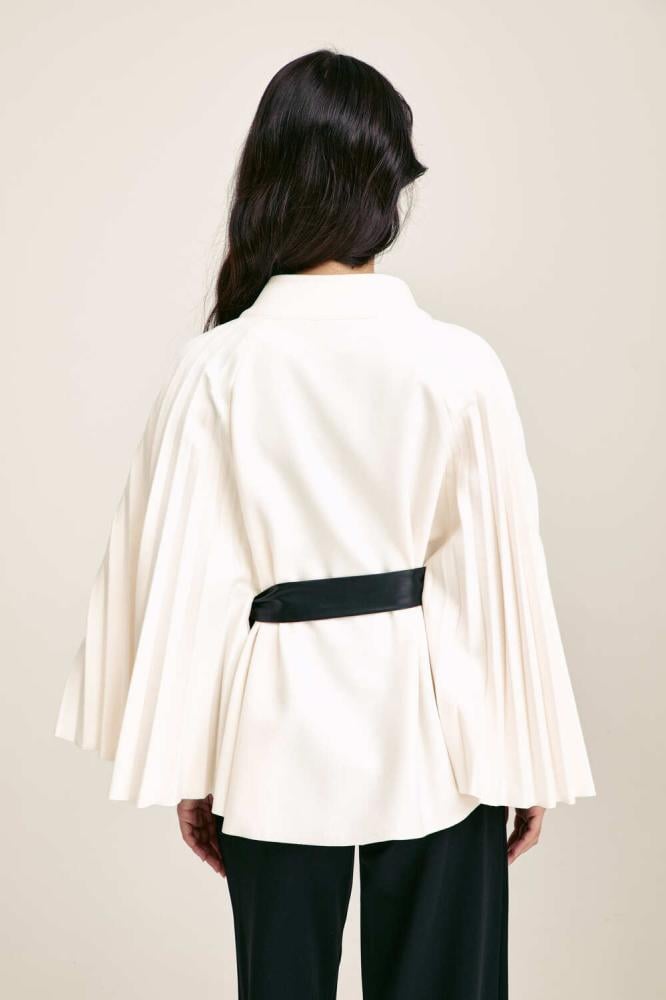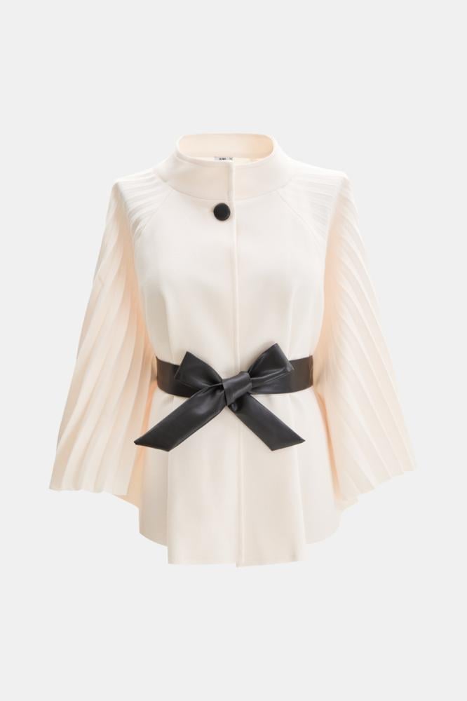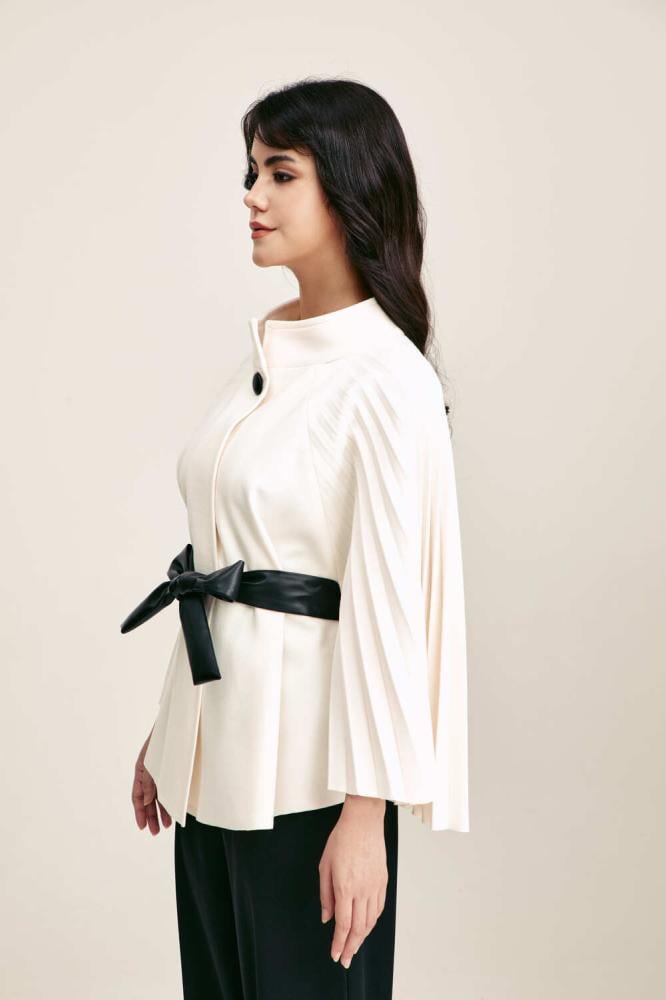 جاكيت كيب أنيق ، مصمم بأكمام كلوش بكسرات وحزام جلد أسود بعقدة أنيقة، يضفي لمسة كلاسيكية عصرية لإطلالة شتوية متفردة.