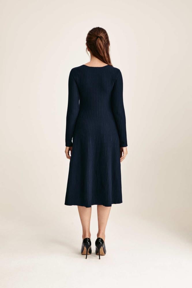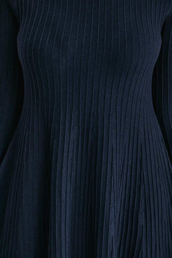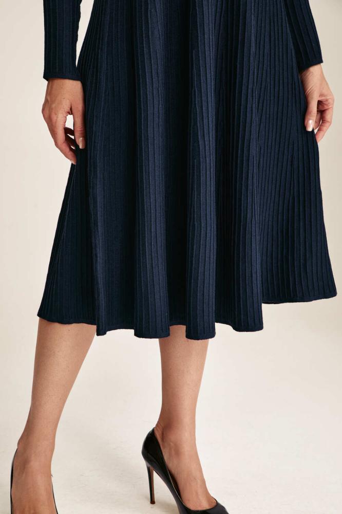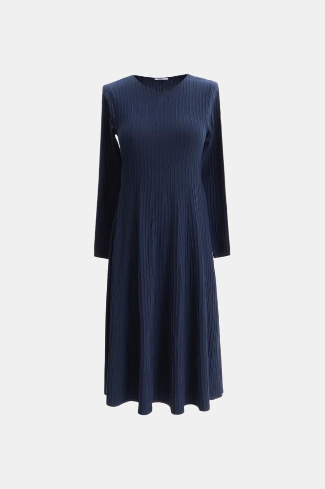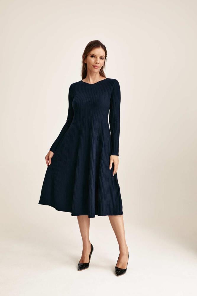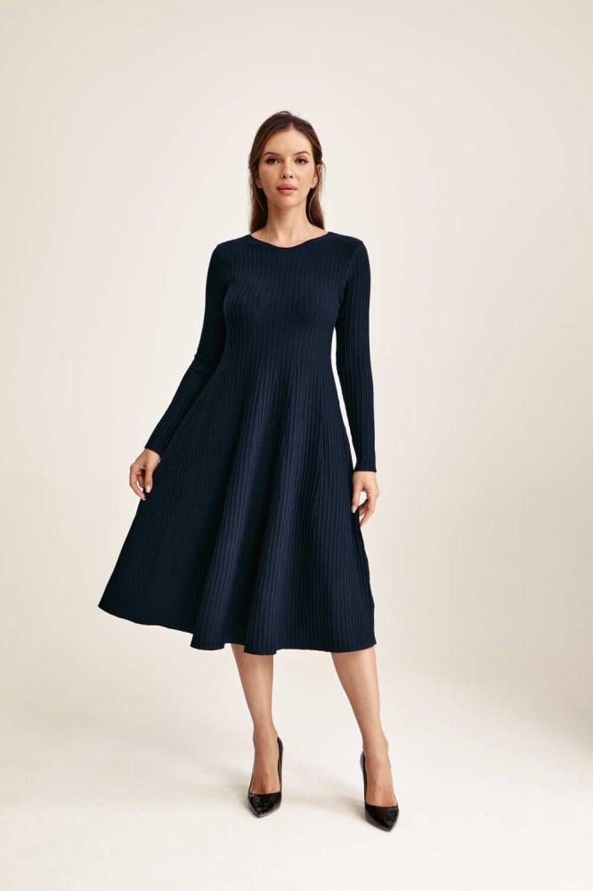 يُمكنكِ اختيار هذا التصميم الأنيق، فستان محبوك بقصة واسعة من أسفل بياقة غير متماثلة وبأكمام طويلة