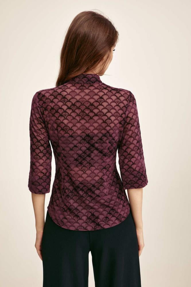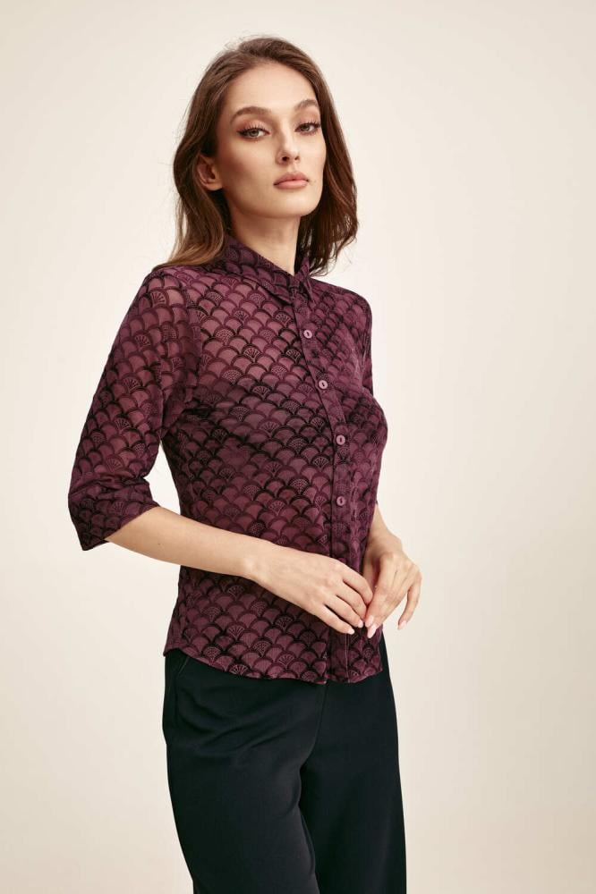 قطعة مميزة تضيف لمسة فنية لإطلالتك اليومية،قميص تول شفاف بقصة ناعمة بياقة مدببة وبأكمام متوسطة ، مزين بطبعات مخملية ملفتة مصمم بأزرار إغلاق أمامية لسهولة الارتداء.