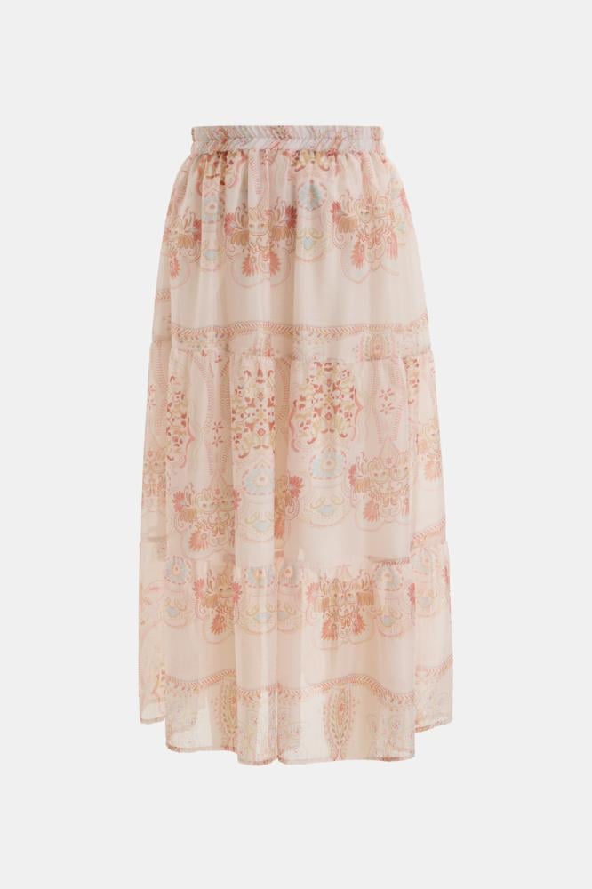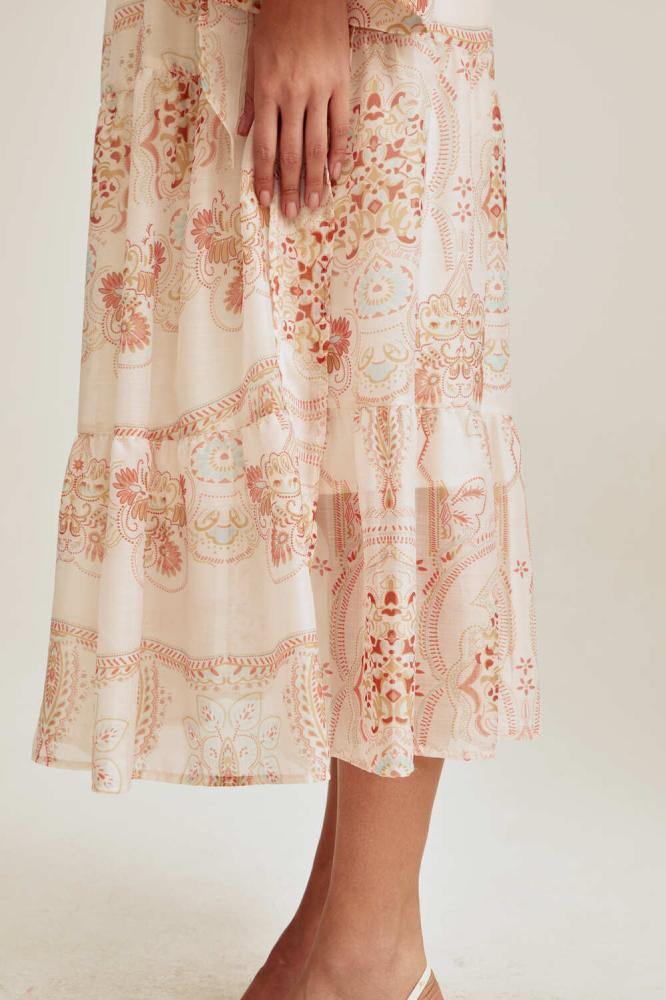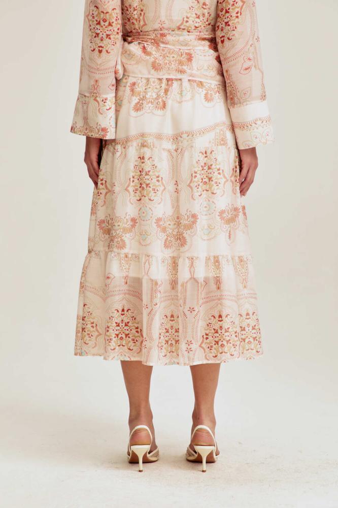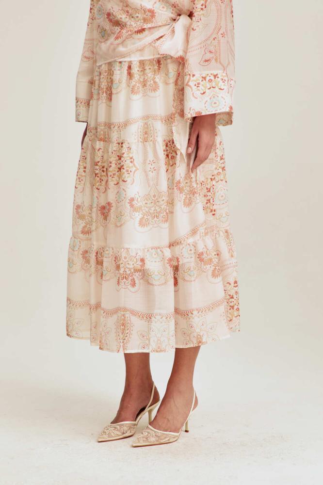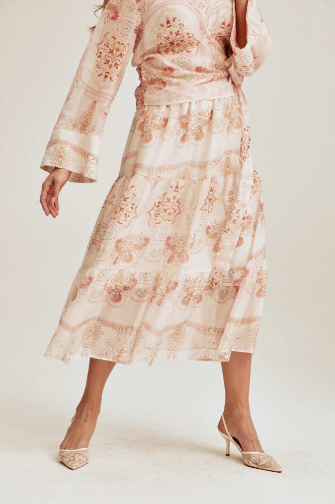 تنورة بقصة واسعة تمنحك حركة انسيابية وإطلالة مريحة،مصممة بخصر مطاطي ونقوش موردة تنبض بالأنوثة.