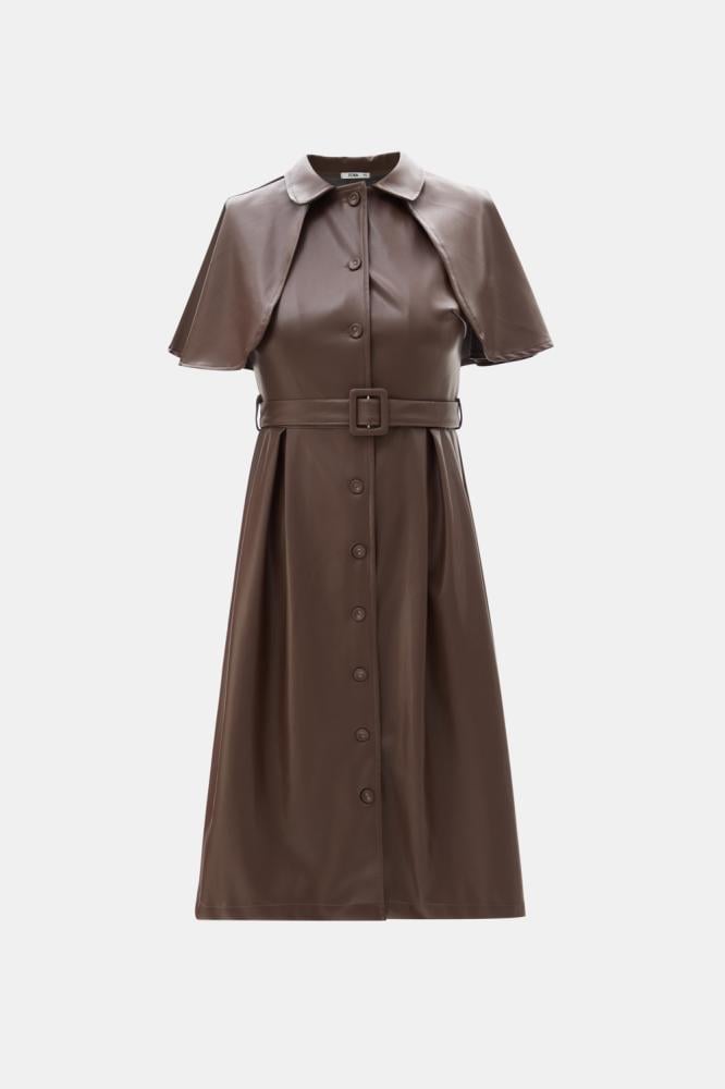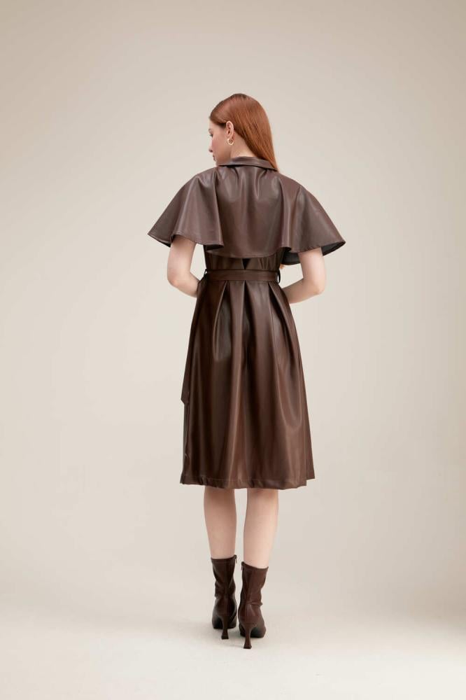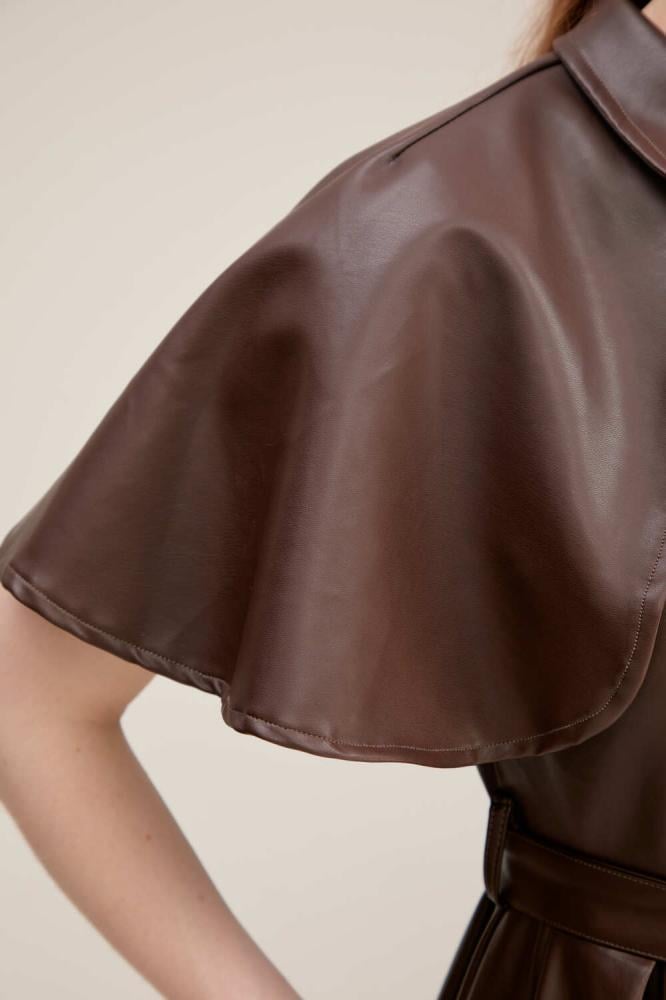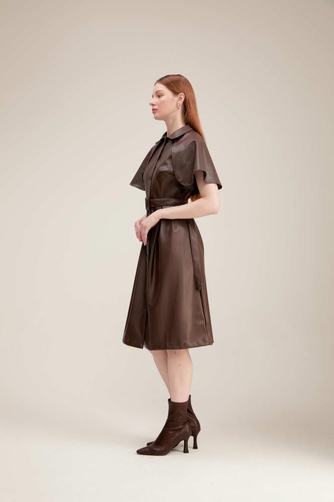 فستان من الجلد الإصطناعي مع أزرار للإغلاق، أكمام كاب أنيقة وحزام لتحديد الخصر. تصميم عصري يجمع بين العصرية والأناقة لإطلالة مميزة.