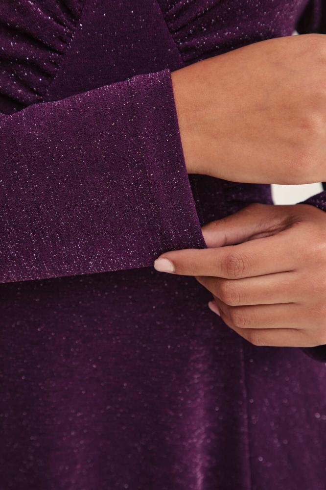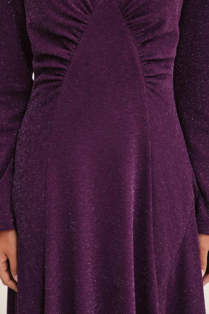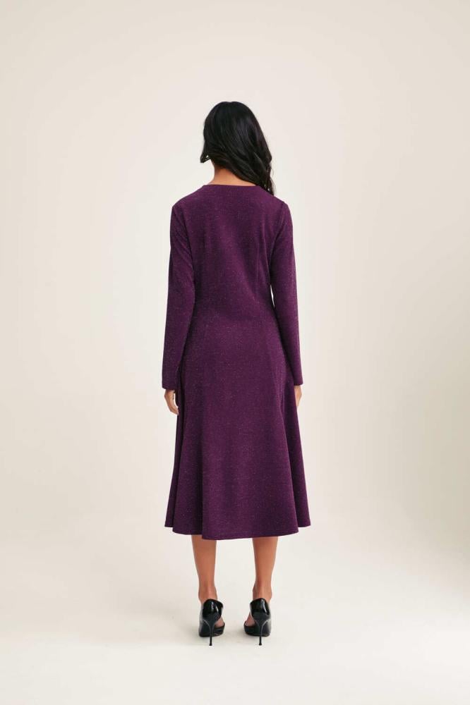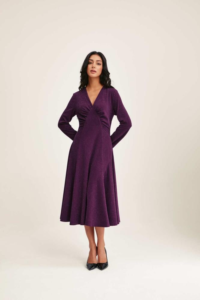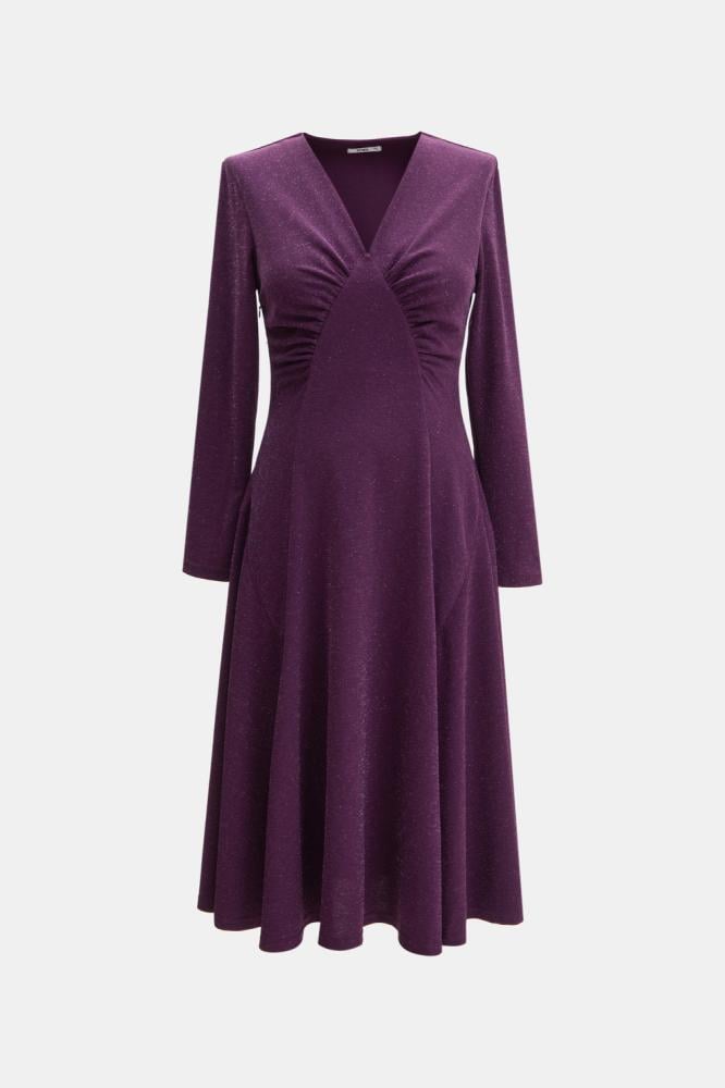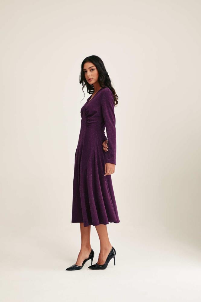 لإطلالة أنثوية مريحة تألقي بفستان بقصة كلوش بياقة على شكل حرف V ، ويأتي بأكمام طويلة ويتميز بتفاصيل مزمومة عند الصدر ،نسقيه مع إكسسورات لمظهر جذاب