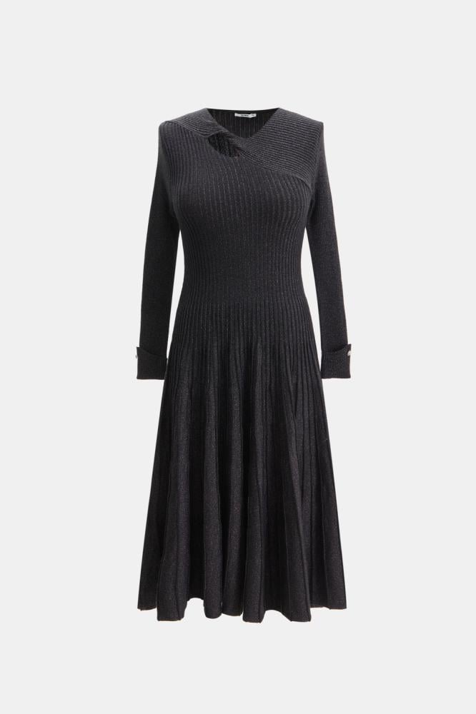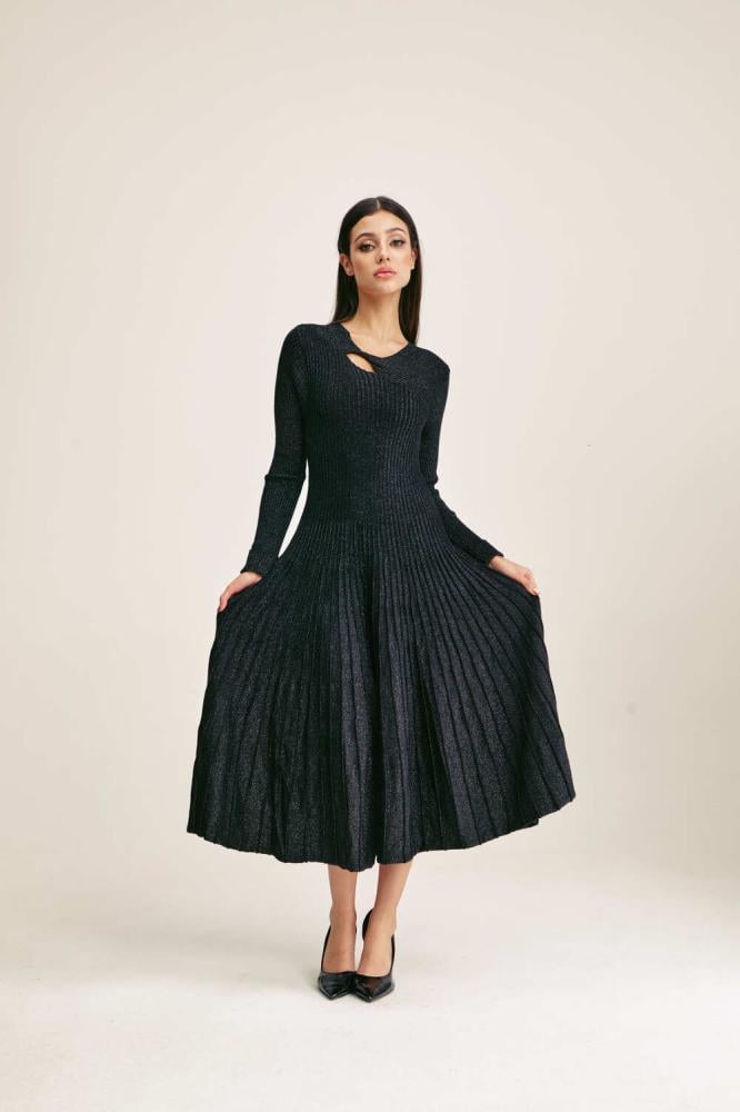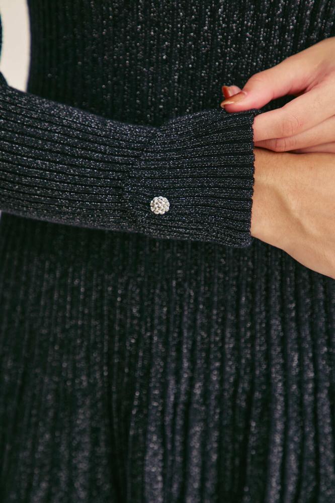 تألقي بإطلالة أنثوية بفستان لامع بياقة مستديرة مزينة بفتحة وأكمام طويلة بأزرار، بقصة إي لاين جذابة وتصميم بطول متوسط نسّقيه مع إكسسوارات لطلة مبهرة ومتكاملة.