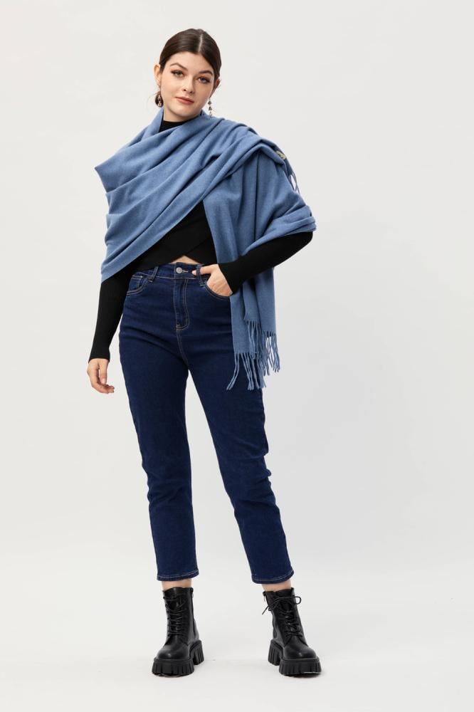 أضيفي لمسة متنوعة إلى إطلالتك في الأيام الباردة ، بوشاح بلون سادة بحواف شراشيب رقيقة تعزز من طابعه الأنيق، نسقيه مع جاكيت لإطلالة شتوية فخمة.