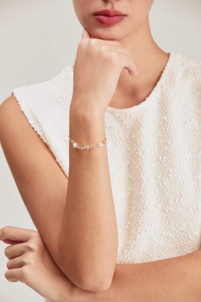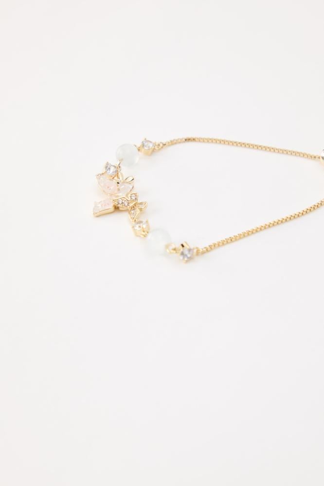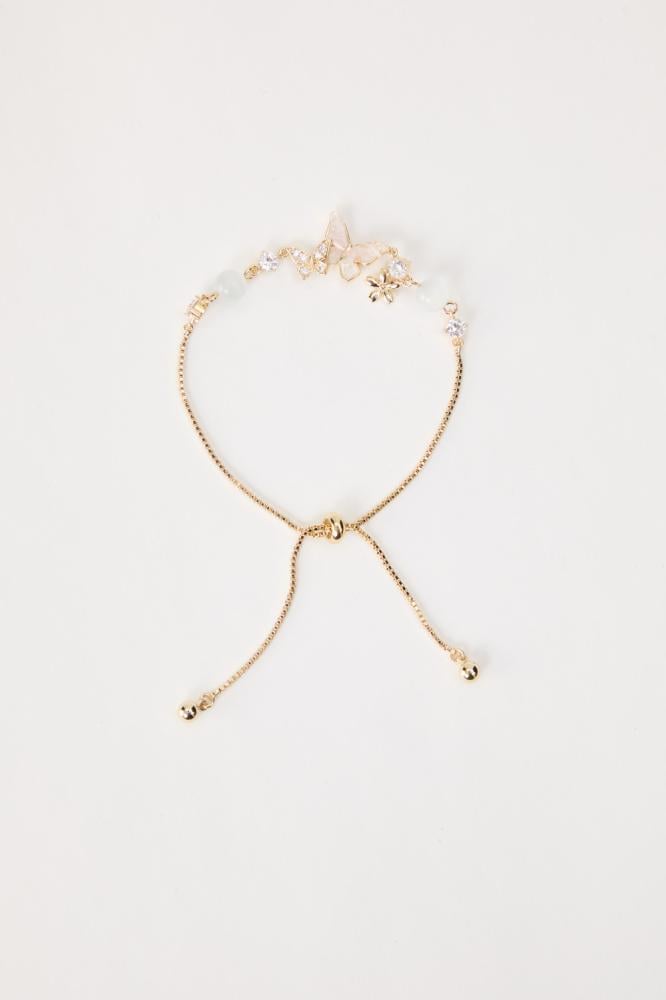اسوارة ذهبية أنيقة تجمع بين الفخامة والابتكار، . يتميز تصميم الإسوارة بقفل سحاب قابل للشد، مما يضفي عملية ومرونة لتناسب مختلف أحجام المعصم. زُينت الإسوارة بفراشات رقيقة تضفي عليها إحساسًا بالحيوية والجمال، مع لمسات براقة من الكريستال اللامع والخرز