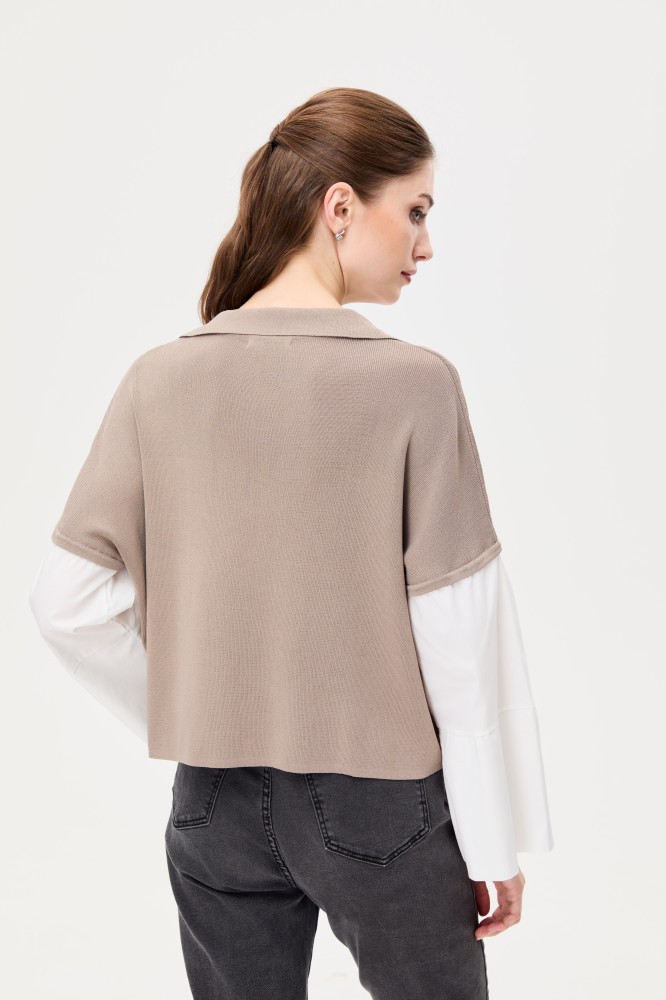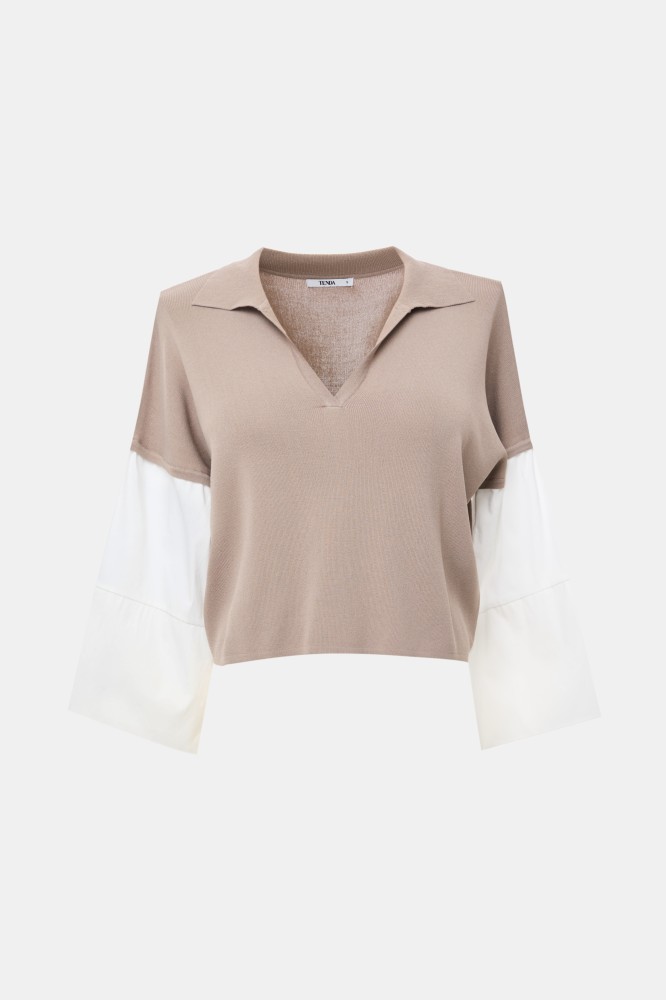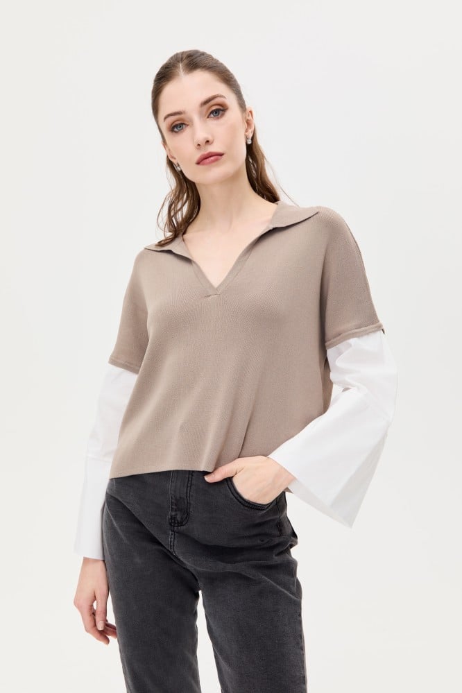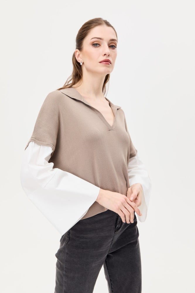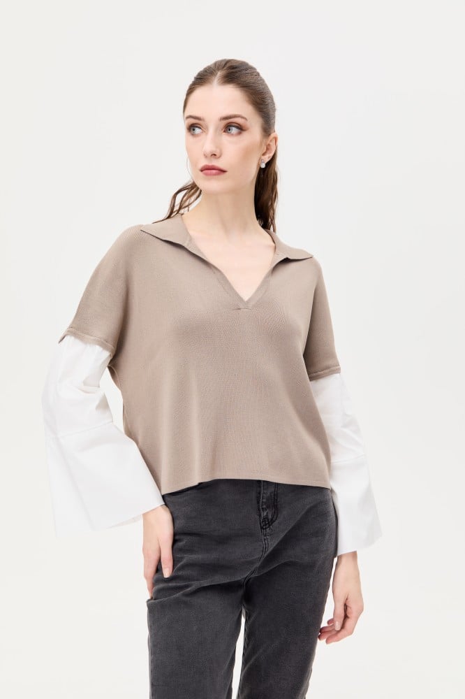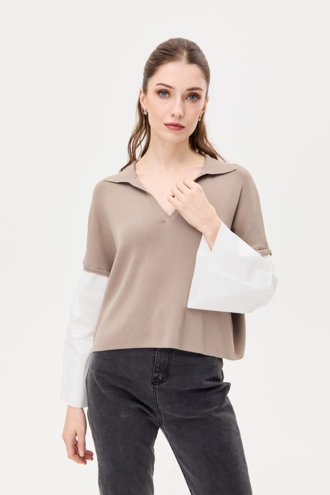 A modern casual two-piece blouse featuring a V-neck and long, wide sleeves. Pair it with jeans for an attractive look.