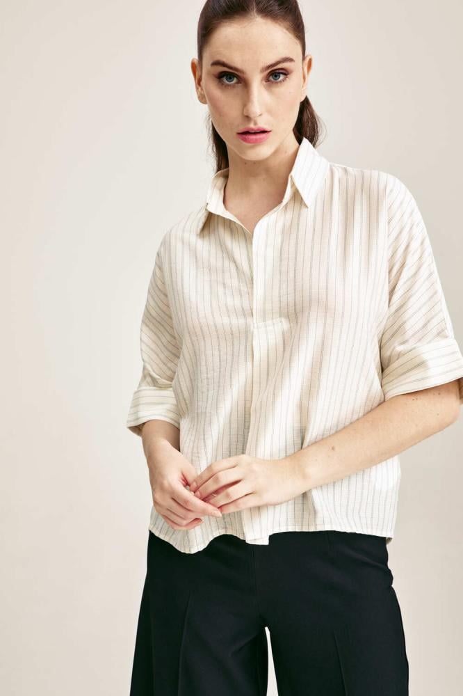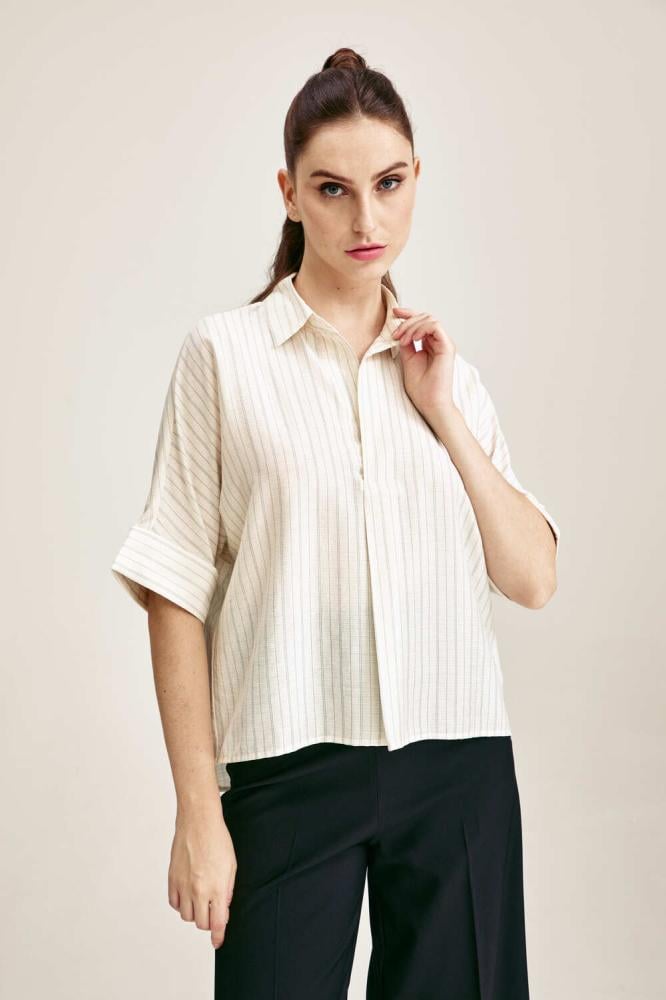 بلوزة بتصميم كلاسيكي يجمع بين الأناقة والراحة ليمنحك إطلالات مفعمة بالثقة مصمم بياقة V بأكمام متوسطة الطول بثنية وتأتي بقصة واسعة
