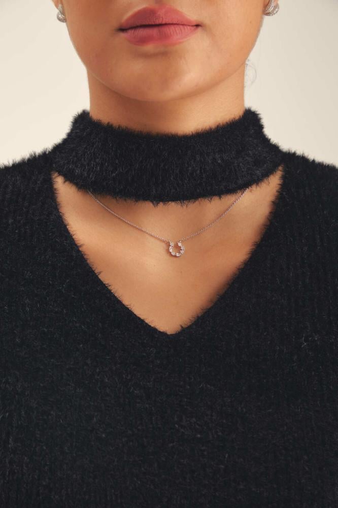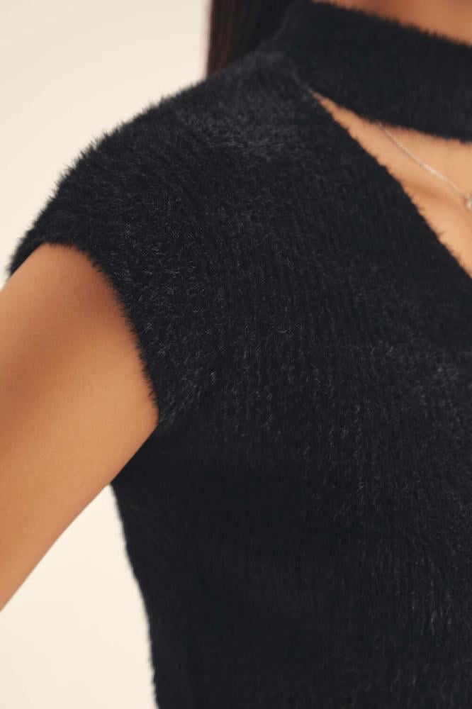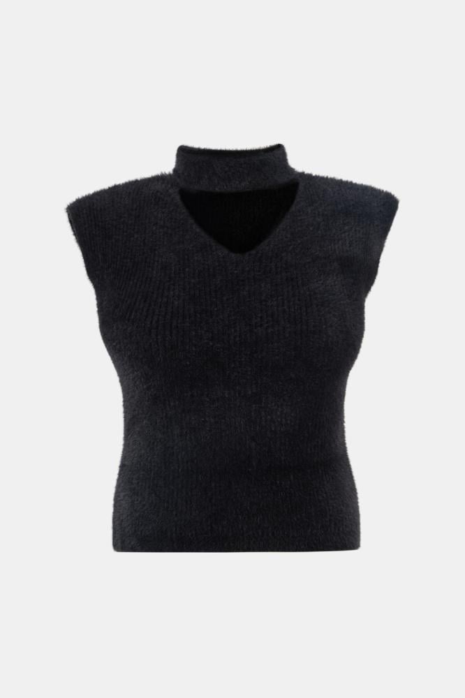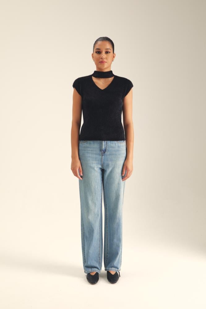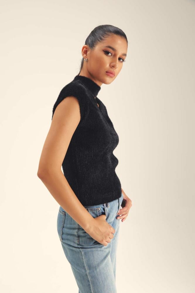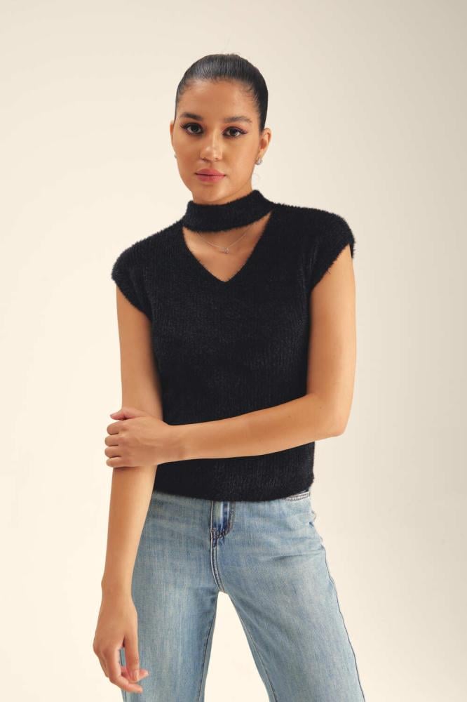 جددي خزانة ملابسك بلمسة عصرية مع هذه البلوزة المحبوكة بخيوط وبرية ، فهي تتميز بأكمام كاب وياقة عالية وقصة مزينة بفتحة عند الرقبة