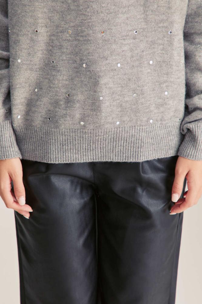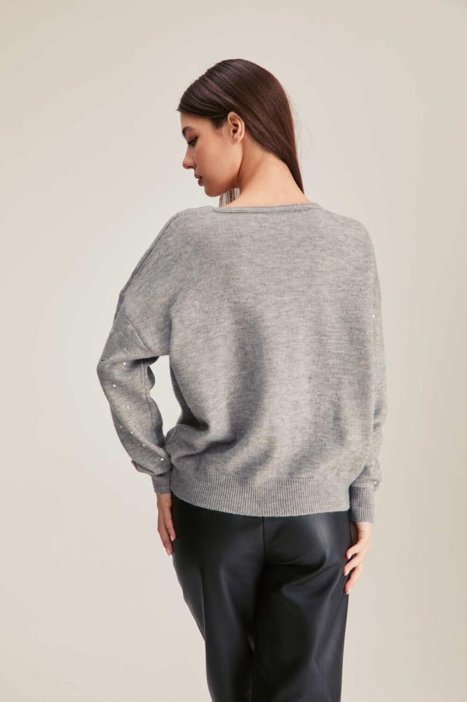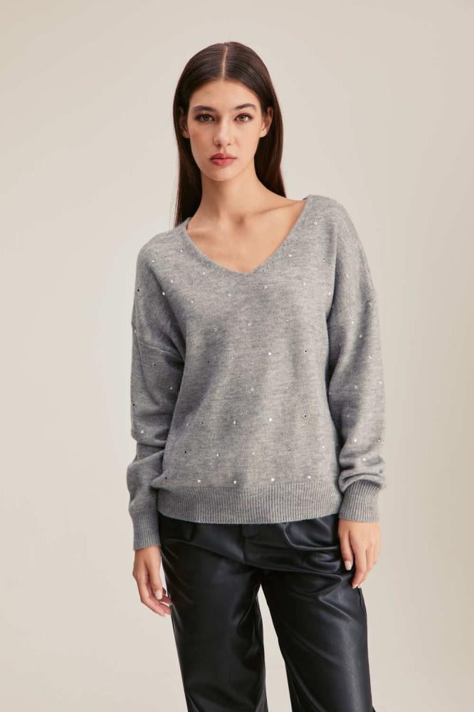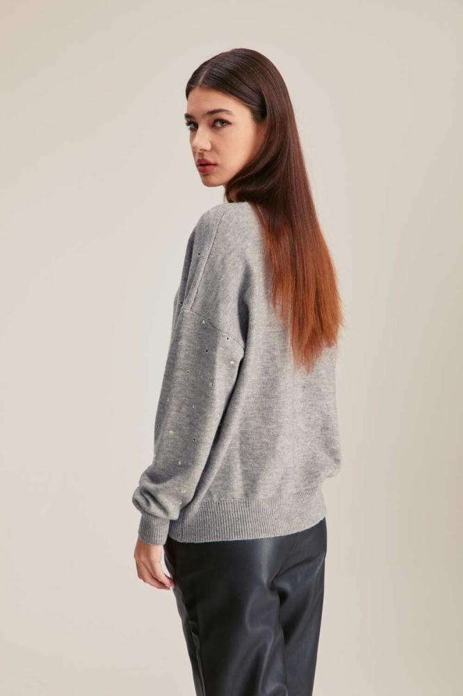 A distinctive addition to your modern wardrobe, this elegant blouse is made of knitted fabric with a V-neck, long sleeves, and is decorated with shiny details, in a wide-cut design.