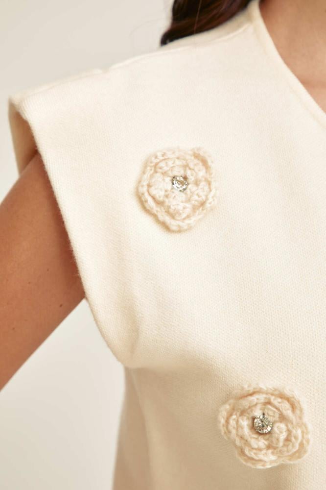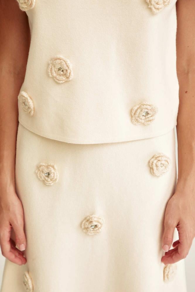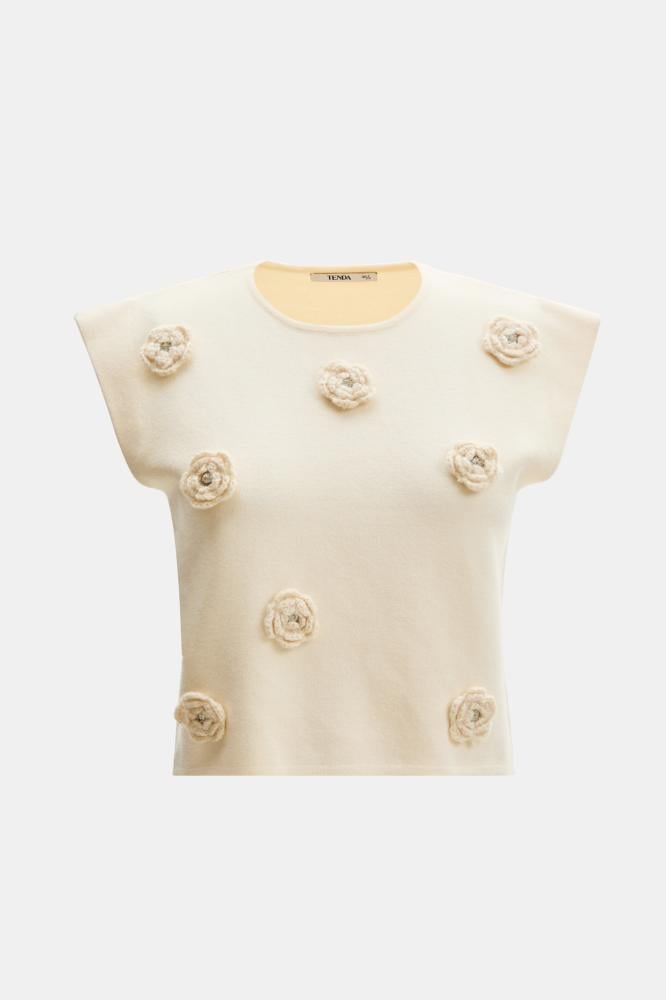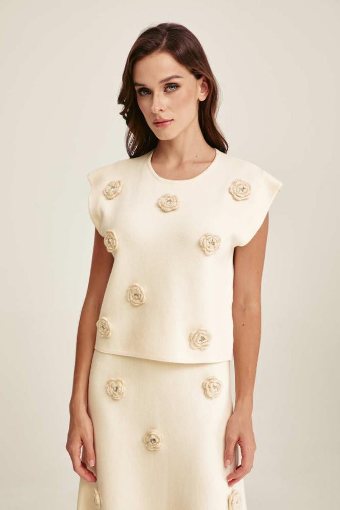 For an elegant look, choose this blouse decorated with prominent roses with sparkling crystal details, designed with a round collar and short sleeves. Coordinate it with a skirt for an attractive look.