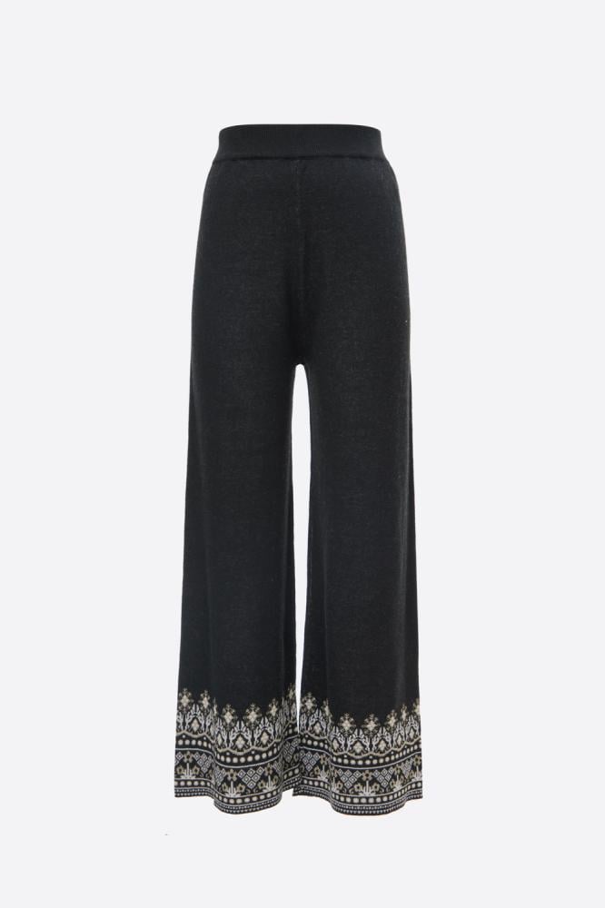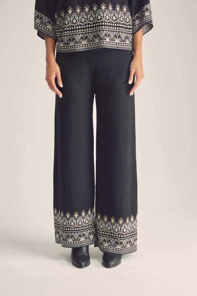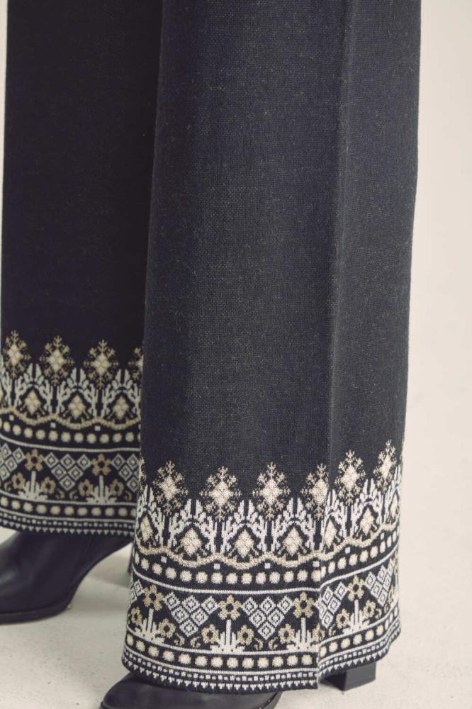 Stay warm and stylish this winter with these distinctive pants with shiny gold touches and geometric patterned edges, elastic waist and wide legs. Wear them with a blouse with a similar design for a modern look.