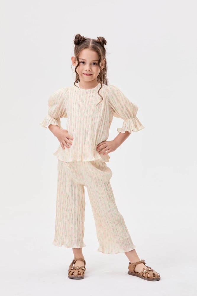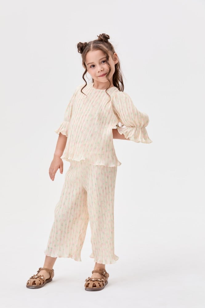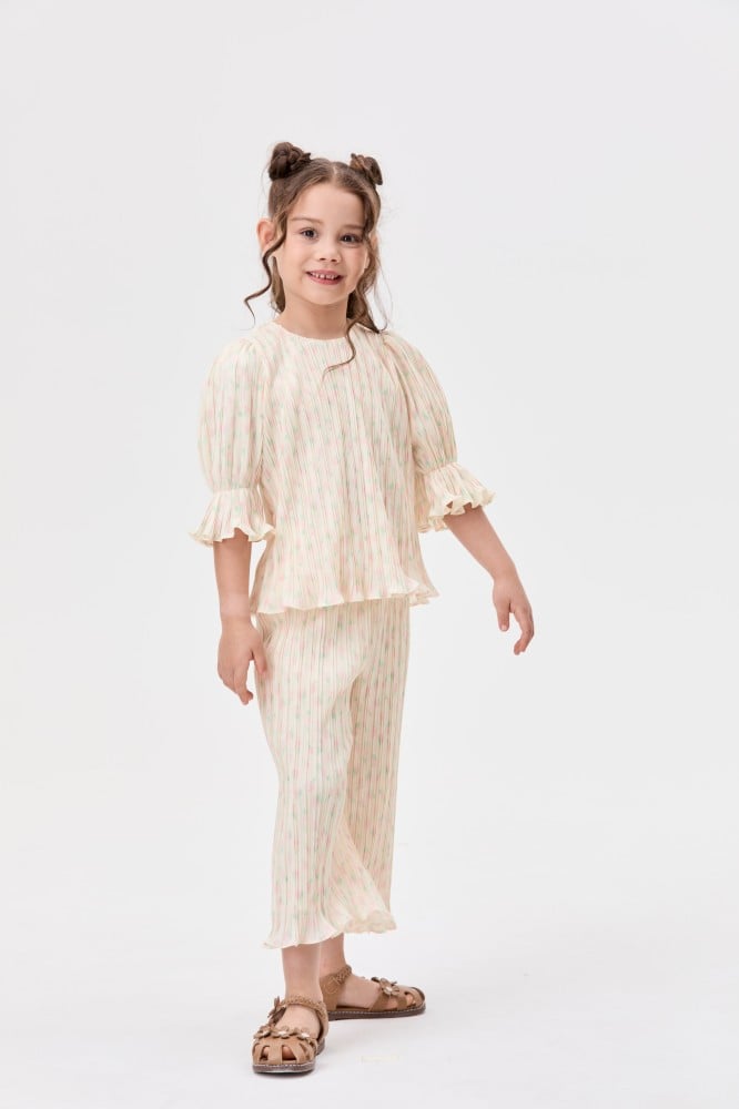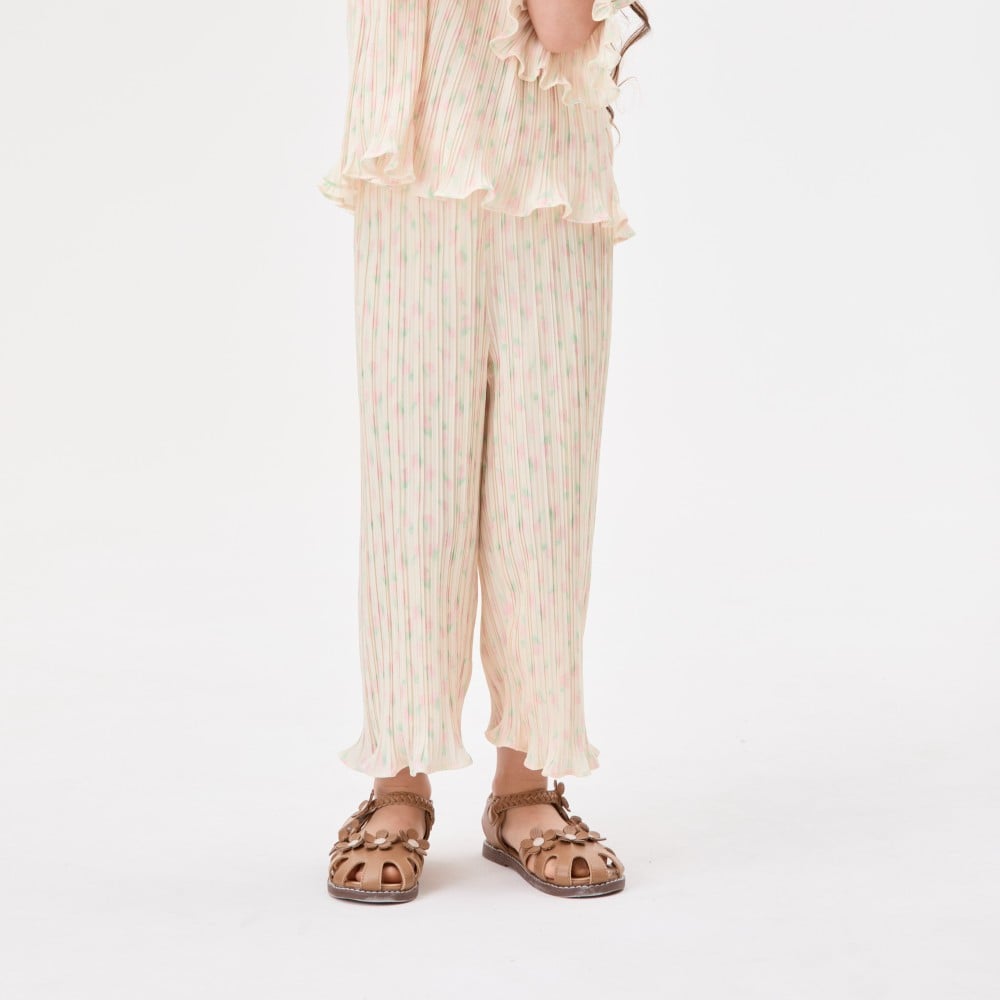بنطلون بلمسات لونية خلابة لإضفاء لمسة مرحة على خزانة ملابس أطفالكم في موسم الصيف.يتميز بتصميم كسرات بخصر مطاطي ومزين بنقوش موردة