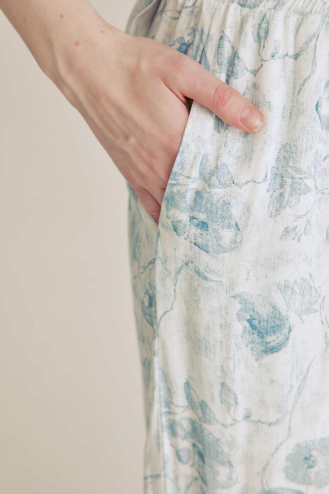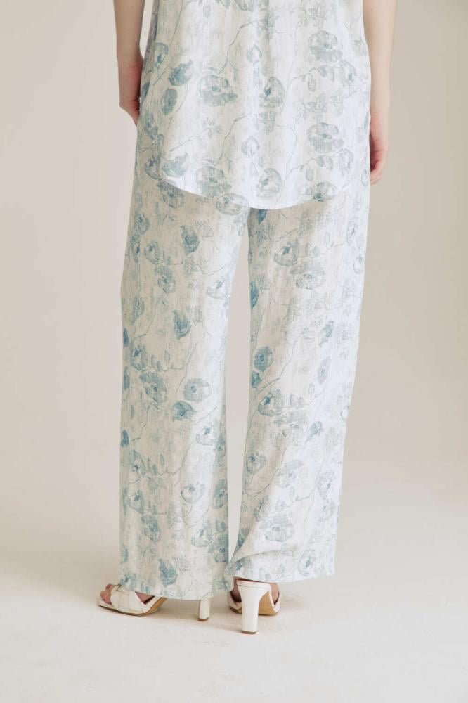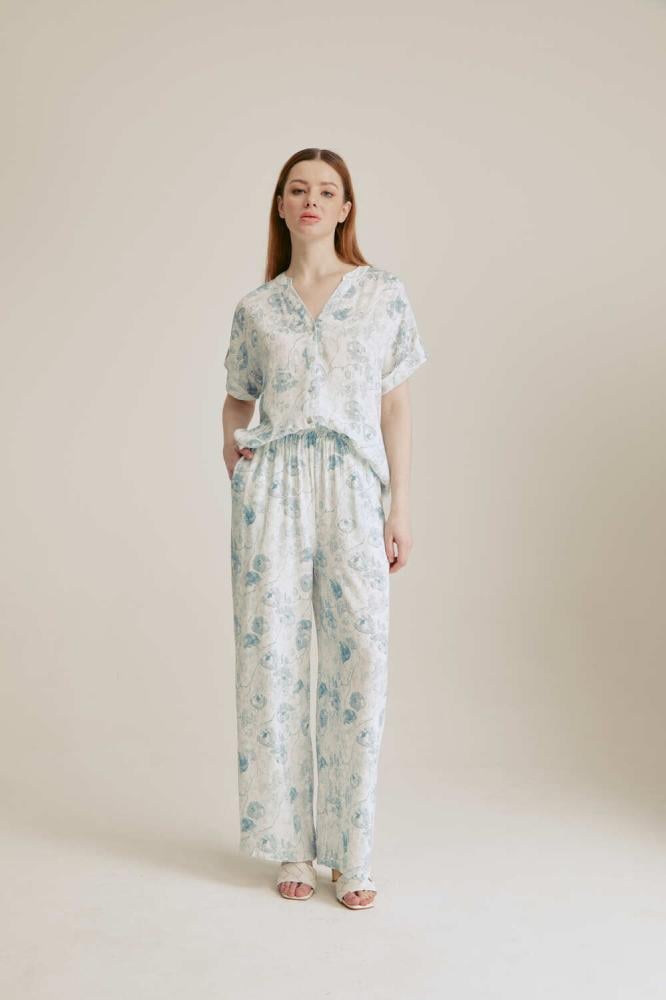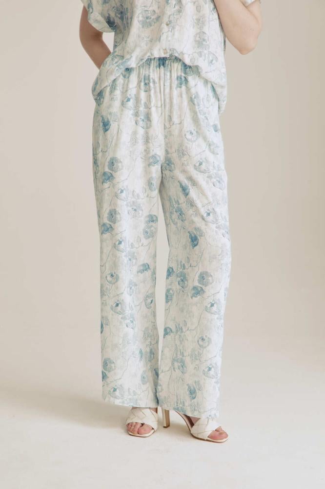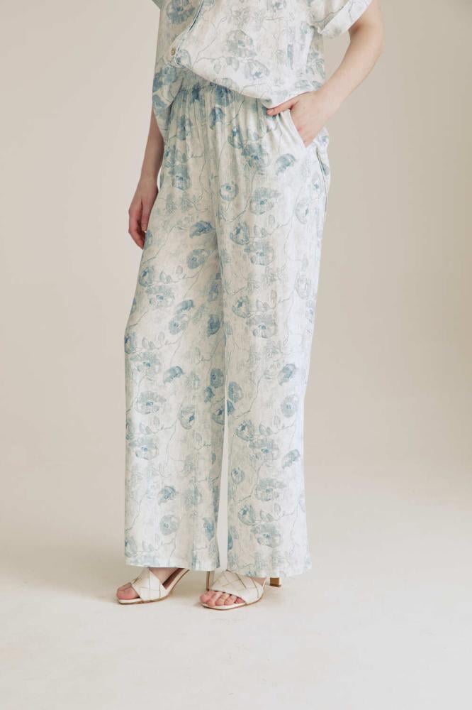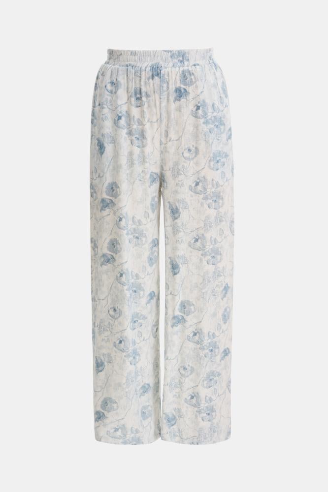 Floral pants with an elastic waistband and wide legs for a comfortable, flowing style. The soft fabric and subtle print add a modern, feminine touch. Pair them with the matching blouse for a complete look that exudes softness.