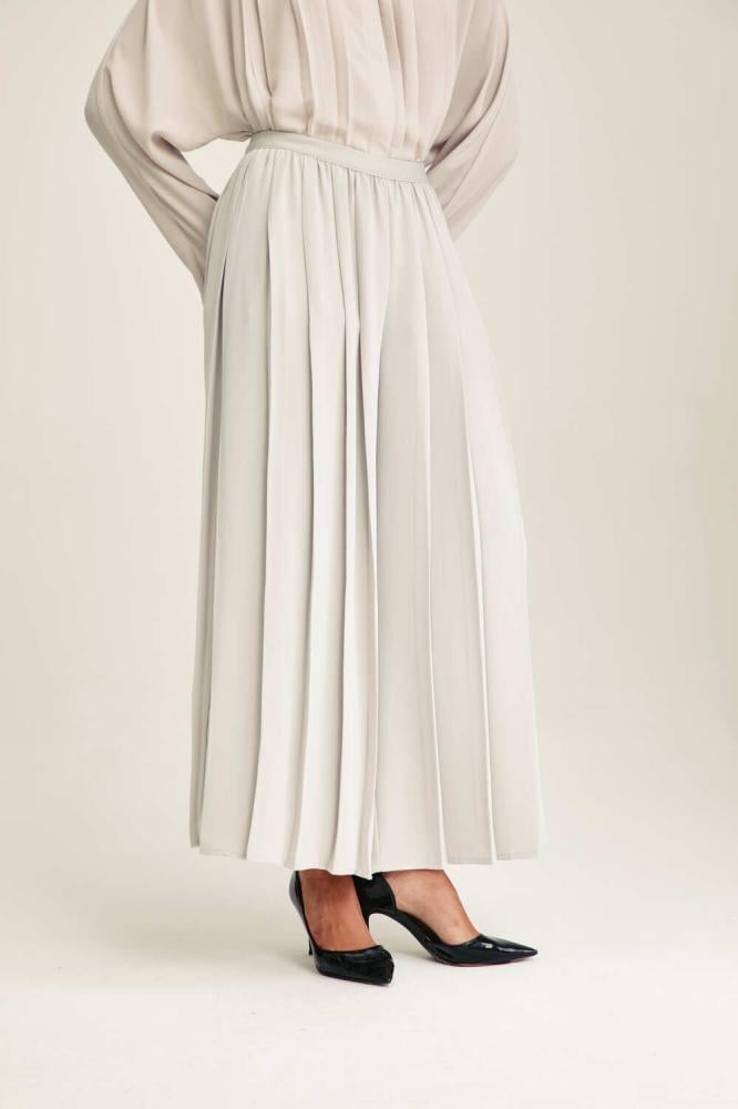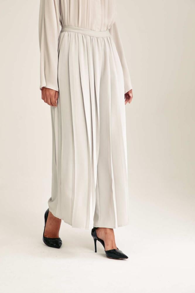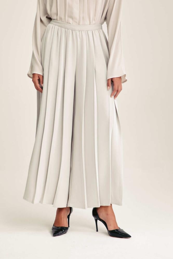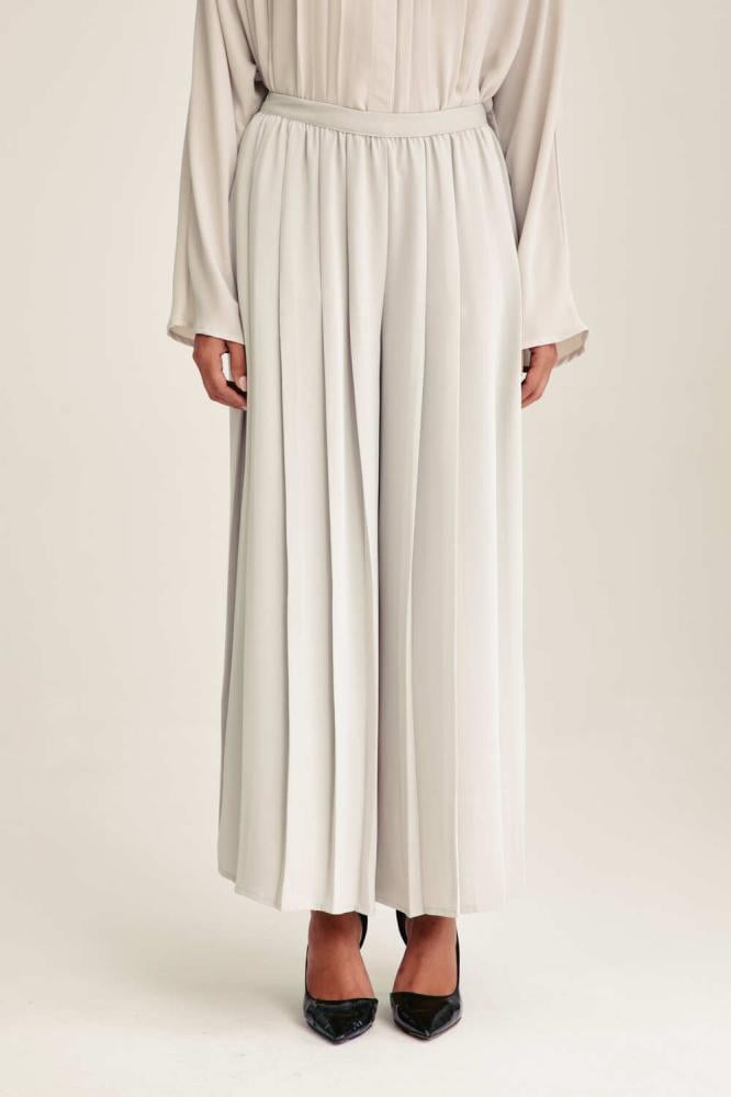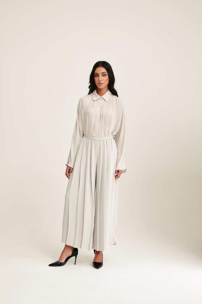 High-waisted wide-leg pleated trousers give you a distinctive elegance, ideal for pairing with a matching shirt for a coordinated look that combines modernity and elegance.