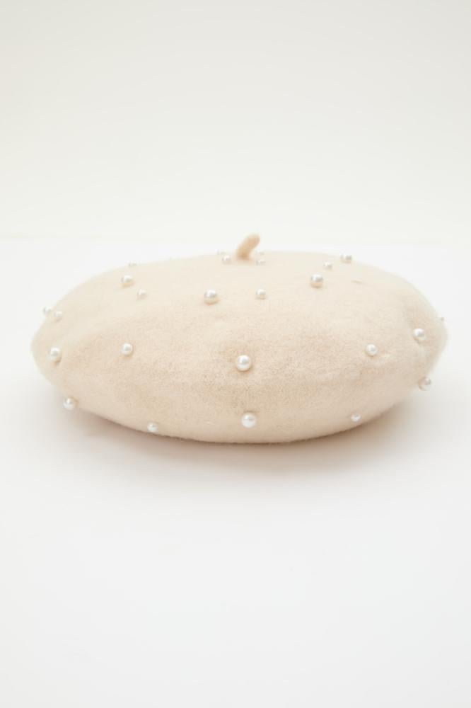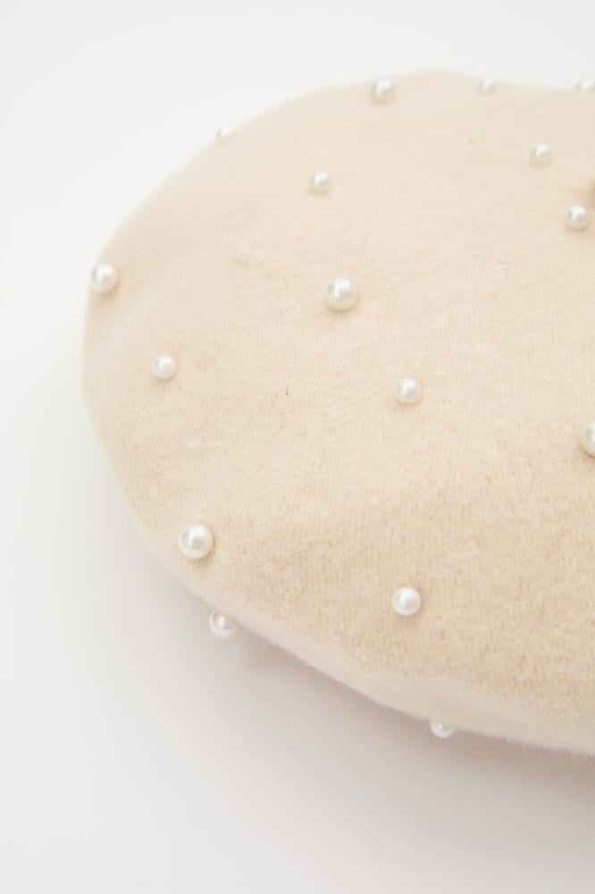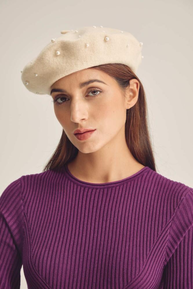 إرتقي بأناقتك هذا الشتاء مع قبعة البيريه المزينة باللؤلؤ ، بتصميم مدور الشكل وخامة نسيج محبوكة ونمط لون موحد