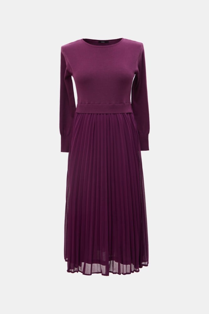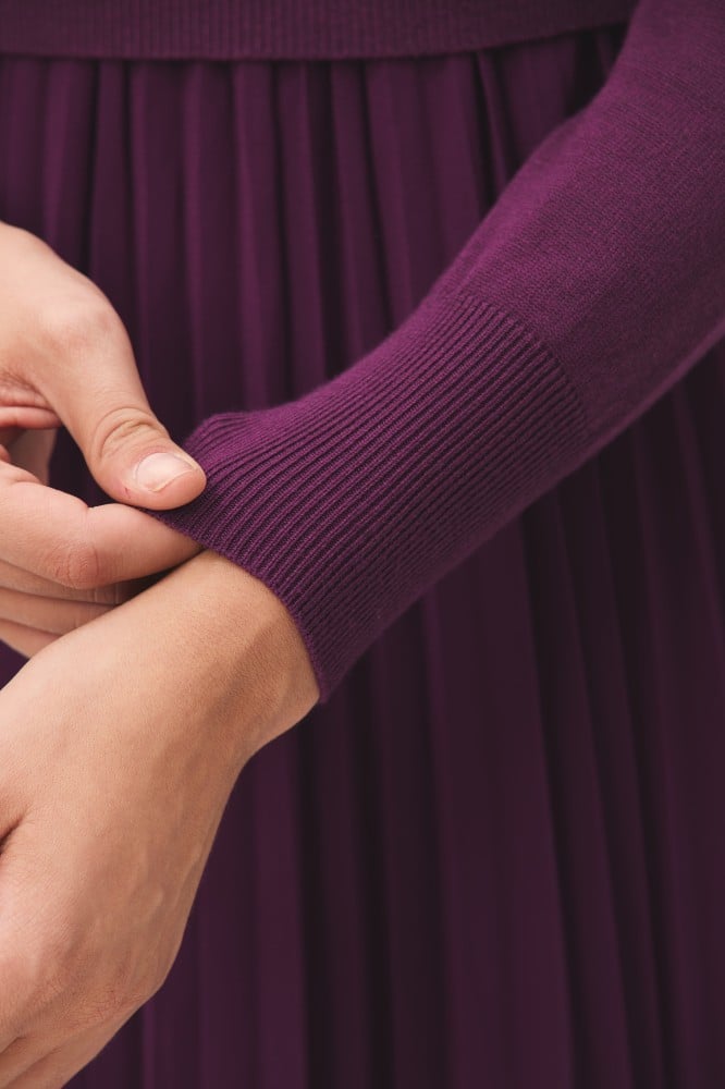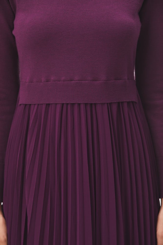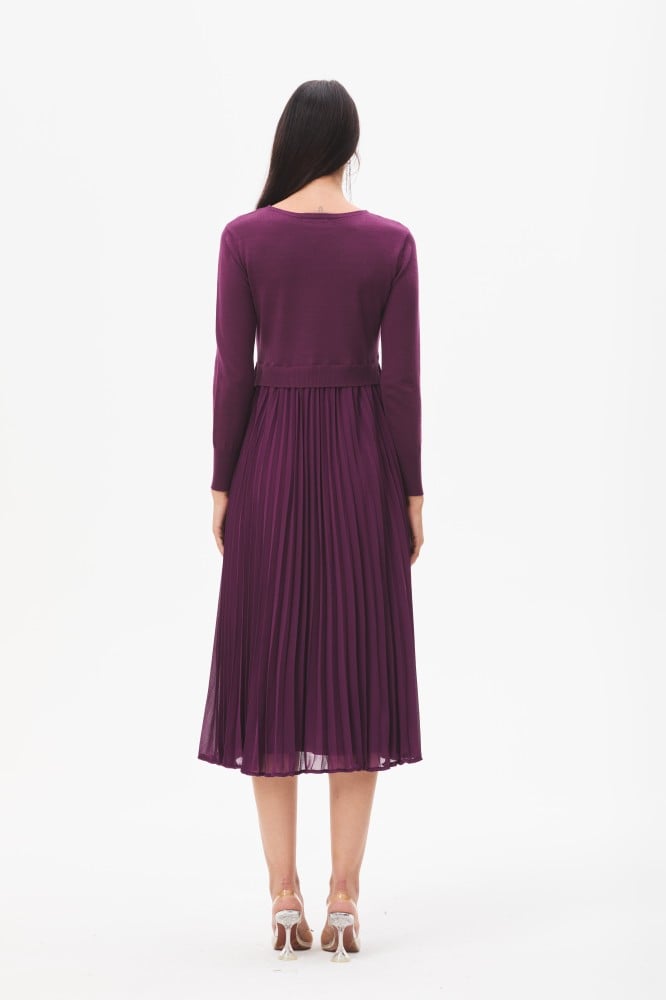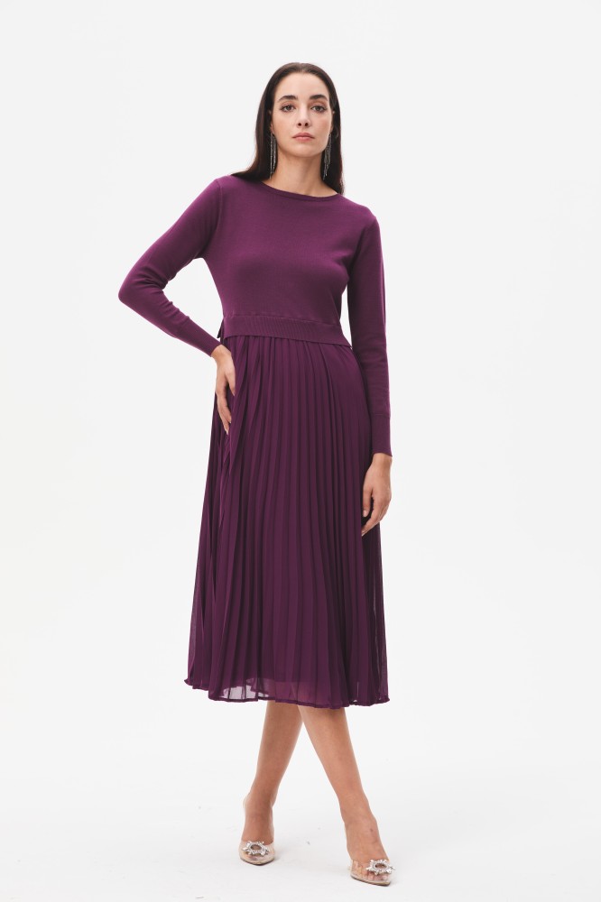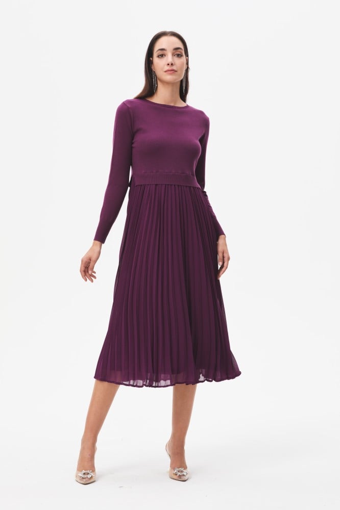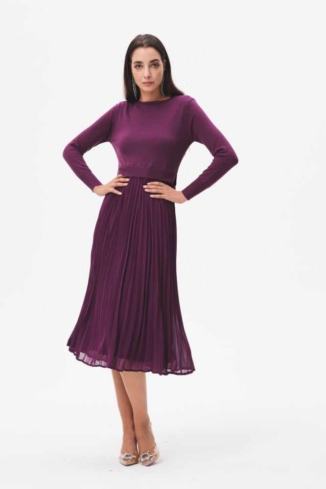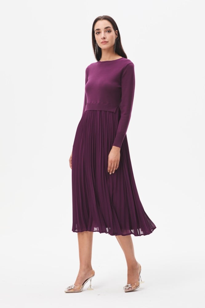 لإطلالة ناعمة ومريحة تألقي بفستان مصمم بجزء علوي محبوك بياقة مستديرة وبأكمام طويلة وبتنورة بليسية من قماش الجورجيت بقصة واسعة