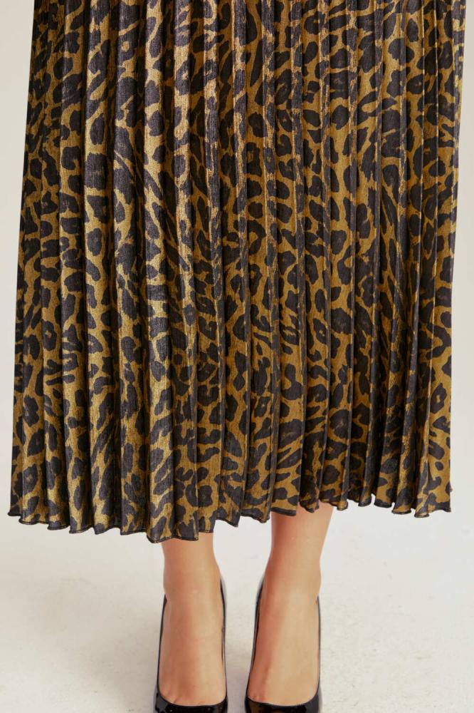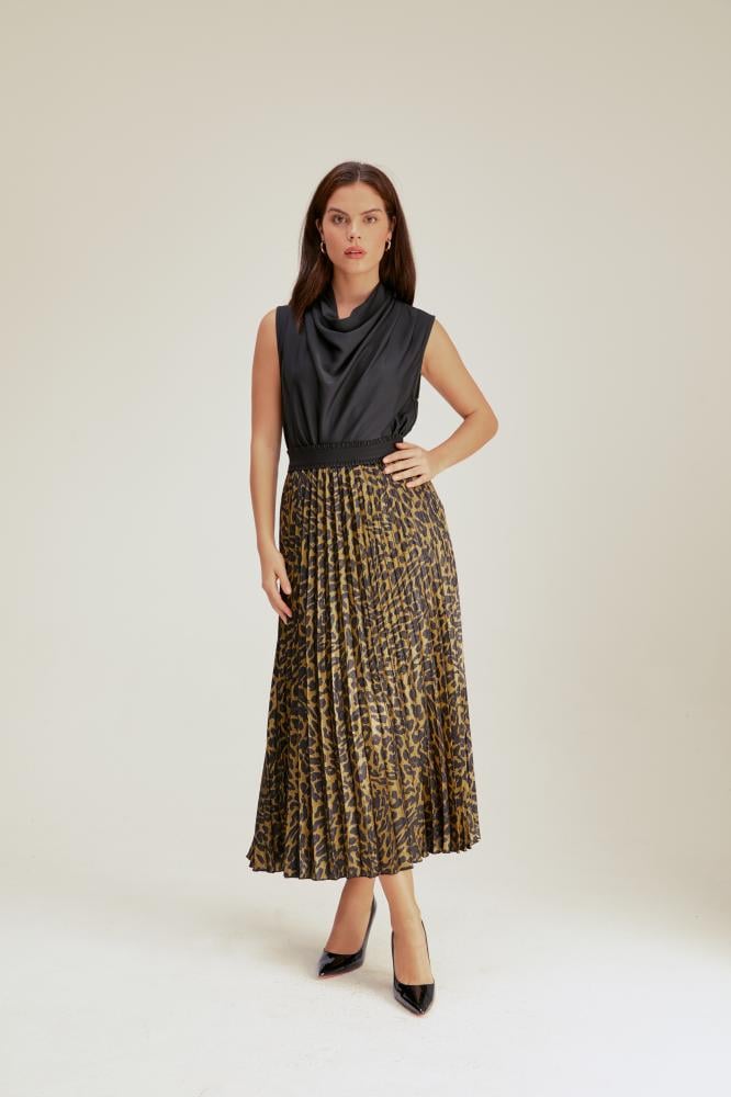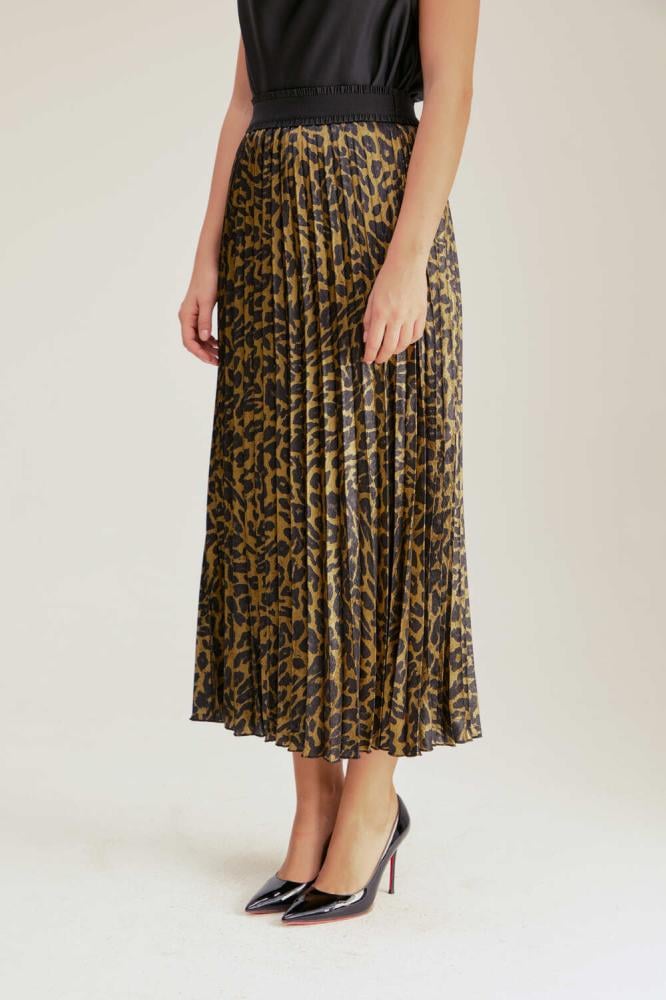 أضيفي قطعة أنيقة من أرقى الأزياء العصرية إلى خزانة ملابسك وتمتعي بإطلالة رائعة مع تنورة تايجر بطبعة جلد النمر الذي تتميز بتصميم أنيق وشكل جذاب. تكتسب التنورة طابعًا كلاسيكيًا خاصًا بسبب قصتها البليسيه الأنيقة، وتضفي عليها نقشة جلد النمر لمسة غاية في الأناقة في المناسبات الرسمية.