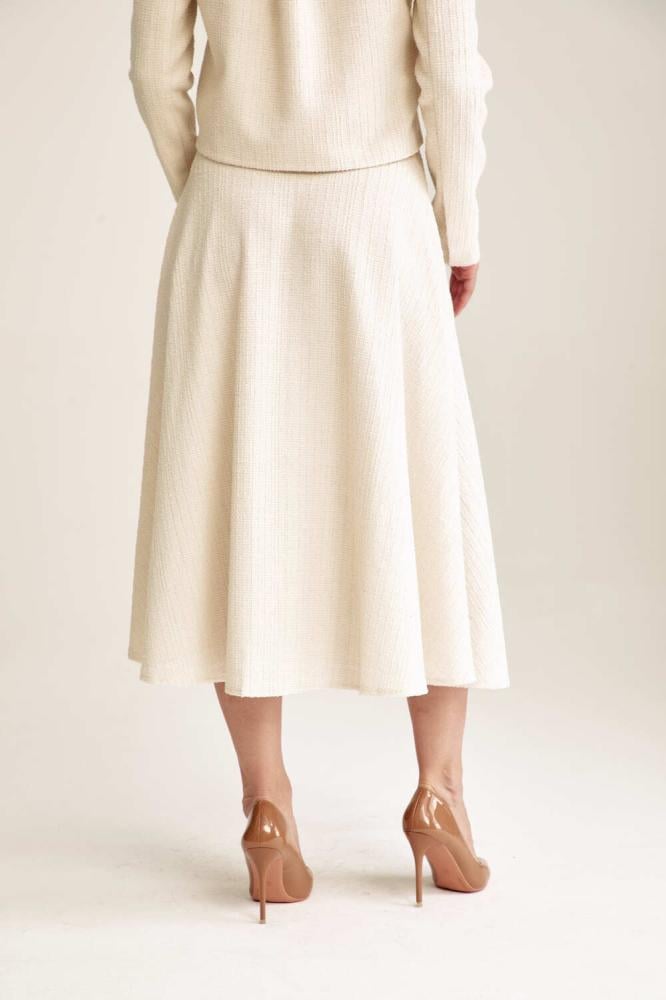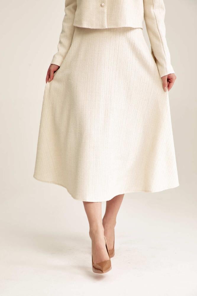 Shine with a feminine, glamorous look with this elegant, textured tweed skirt. Featuring a midi length, a flared cut, and a concealed zipper closure, this skirt pairs with a jacket for a classic, glamorous look.