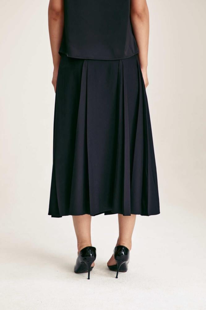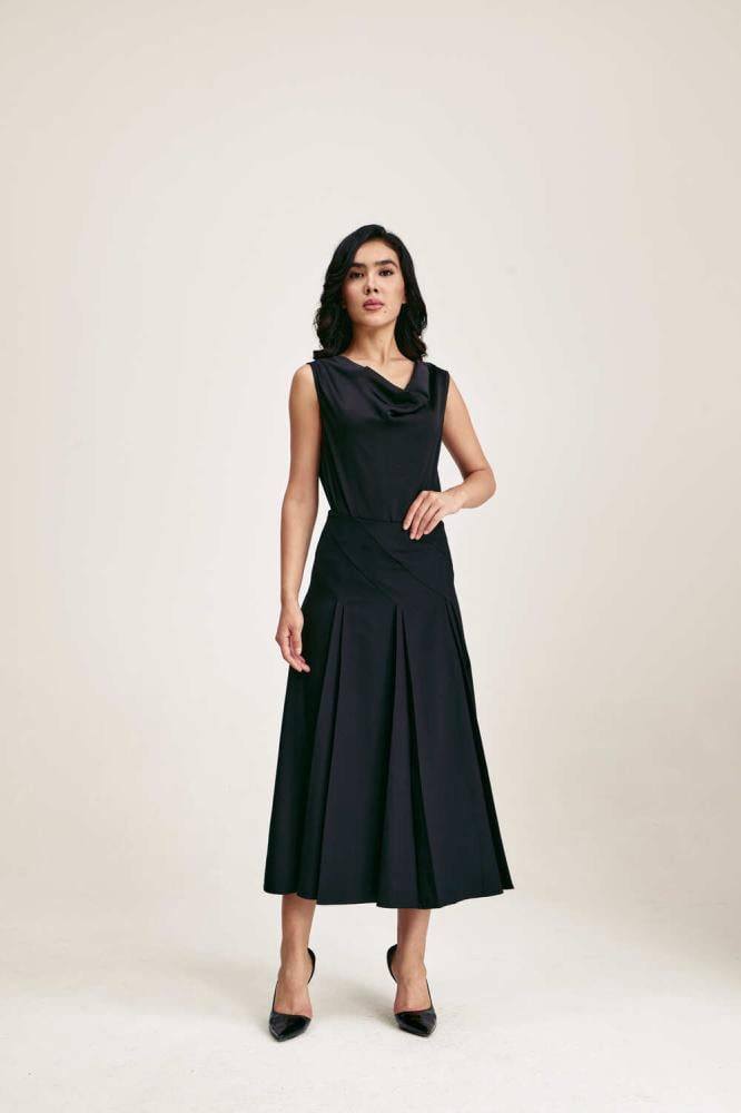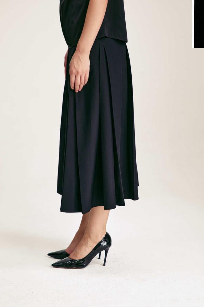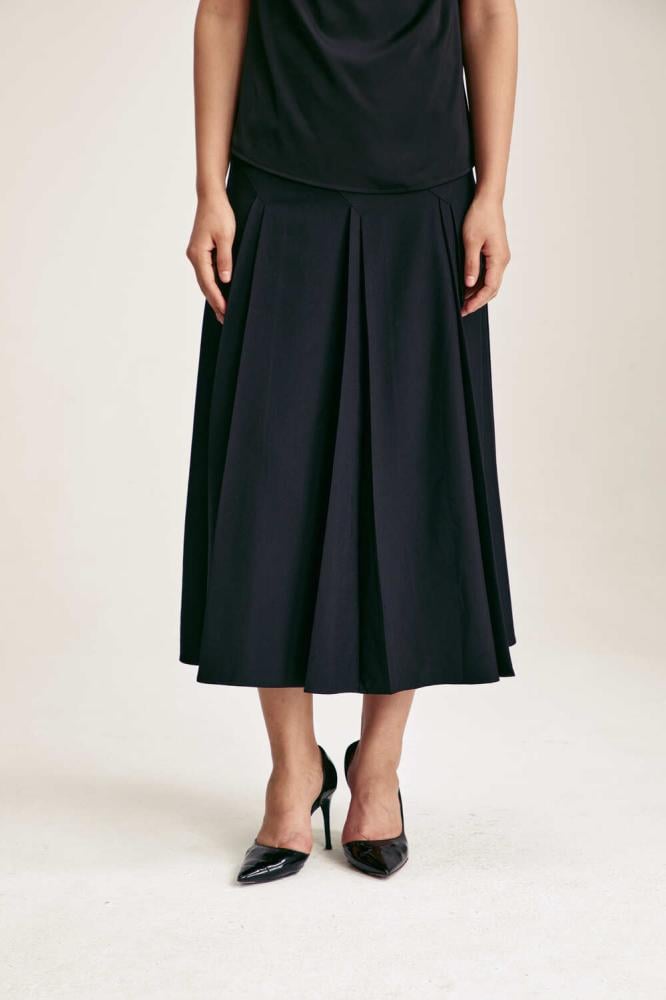 تنورة ميدي أنيقة ، تتميز بقصّة خصر مرتفع وتفاصيل بليسيه ناعمة تمنحها حركة انسيابية جذابة. مصممة بخطوط مائلة تضيف لمسة عصريةخيار مثالي لإطلالة رسمية أنيقة خلال ساعات الدوام.