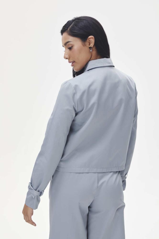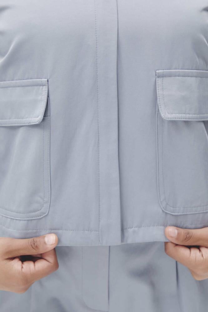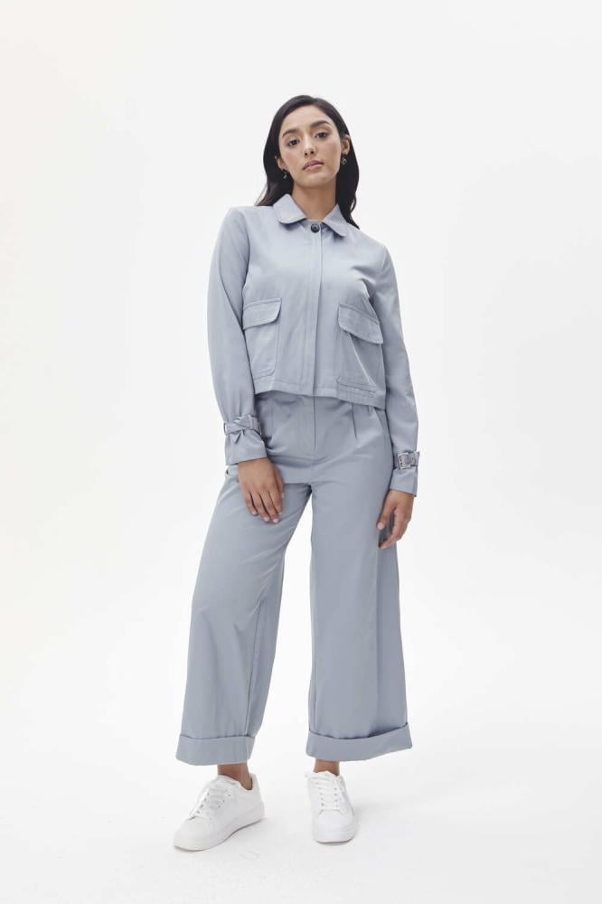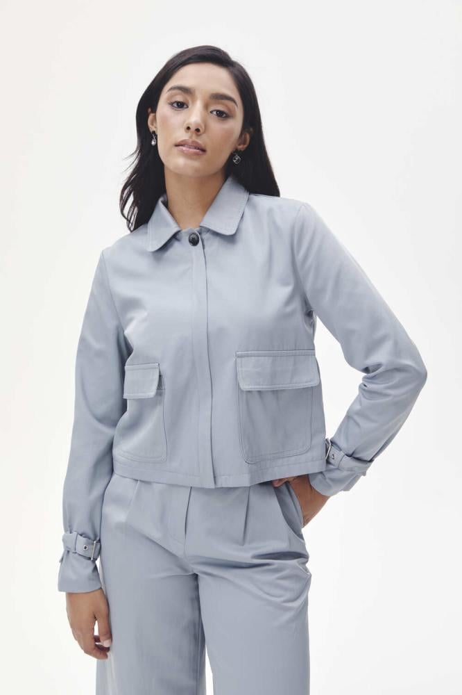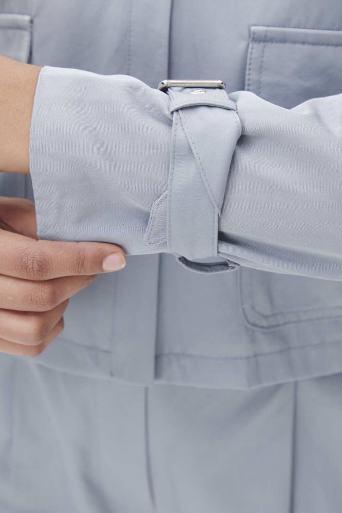 A stylish zip-up jacket with practical pockets and belted sleeves with a stylish buckle closure. A design that combines practicality and modernity.