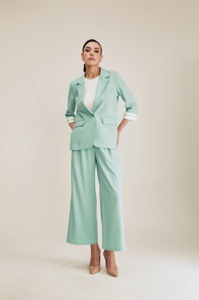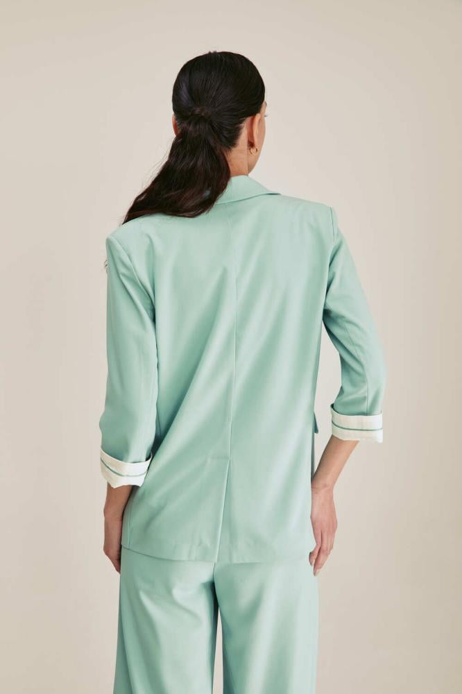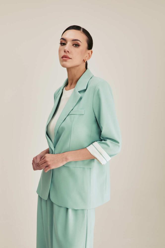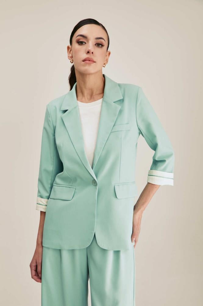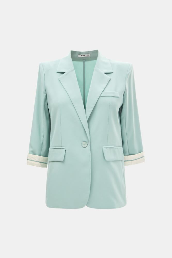 Classic with a modern touch! This jacket features an open front in a solid color and medium-length sleeves with a pleat.