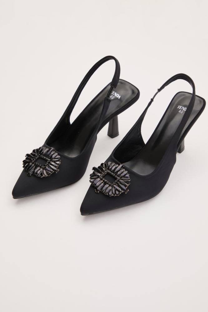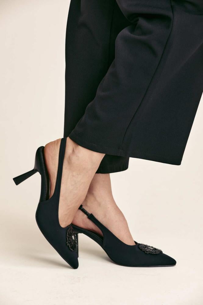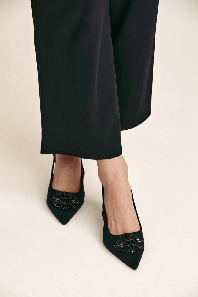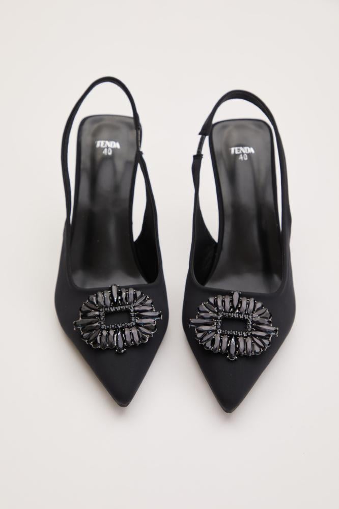 حذاء راقي بتصميم يجمع بين الأناقة والراحة. يتميز بمقدمة مدببة وكعب أنيق،يزدان الحذاء بأحجار براقة باللون الأسود تضيف لمسة فخمة لافتة.