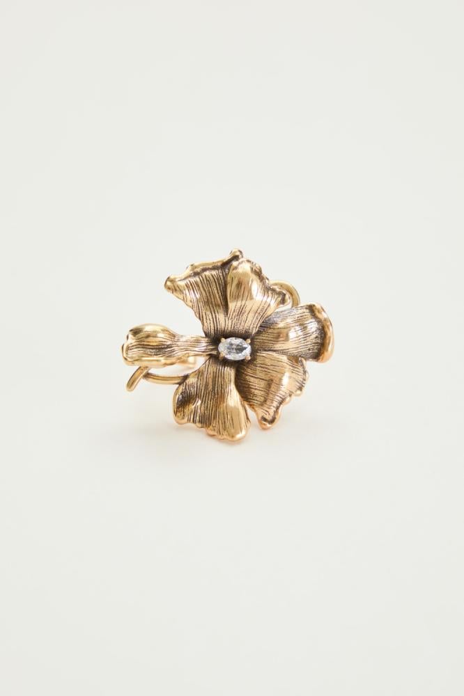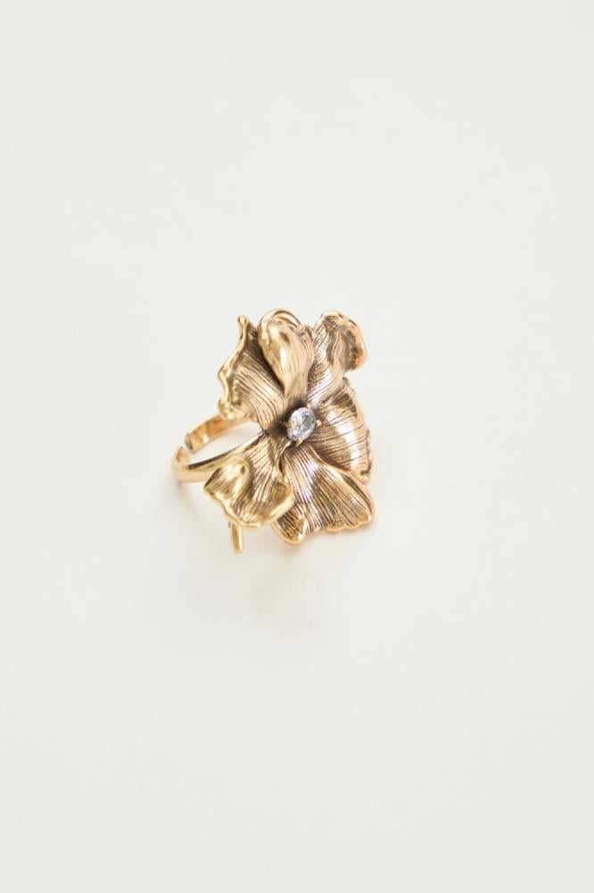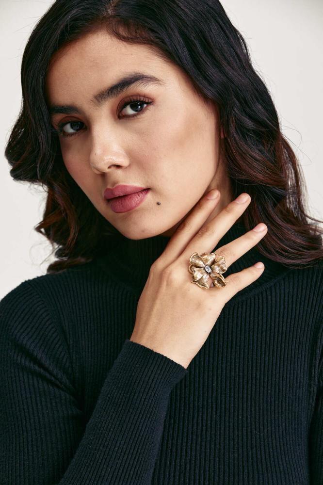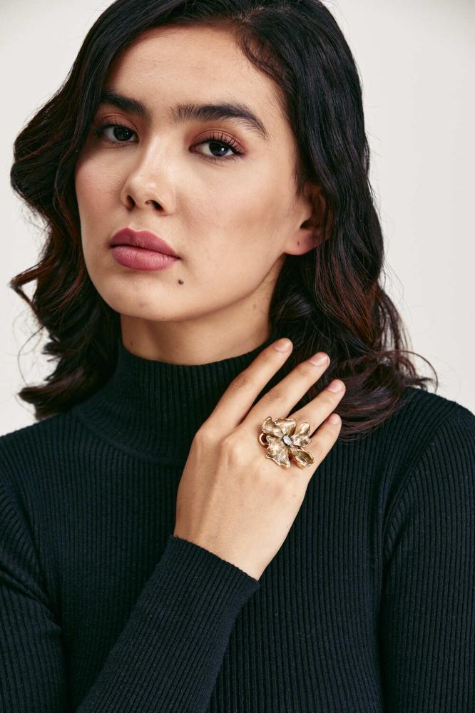خاتم ذهبي بتصميم وردة كبيرة، مزين بكريستالة لامعة تتوسطه ببريق آسر. قطعة جريئة تنطق بالأنوثة والفخامة، وتمنح يدك لمسة مميزة في كل مناسبة