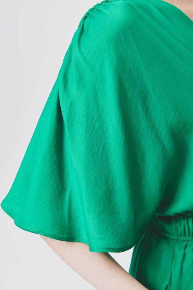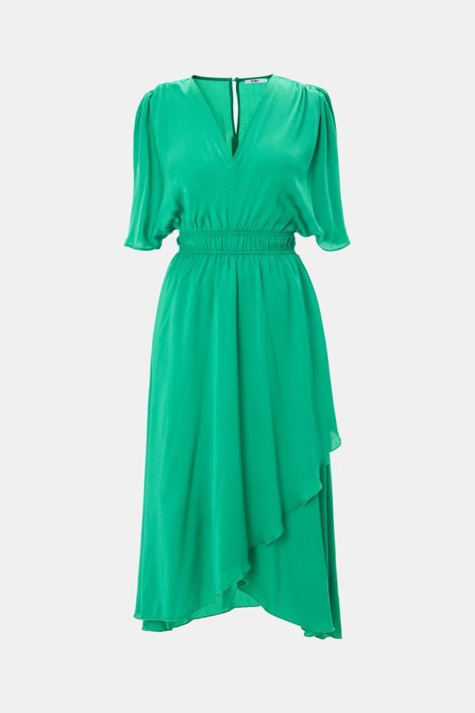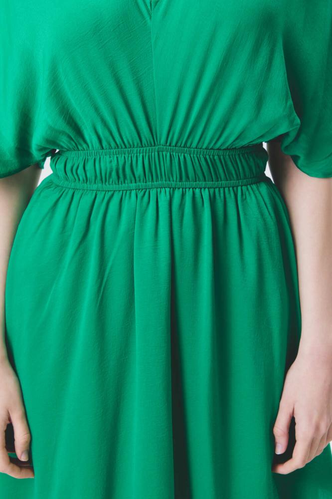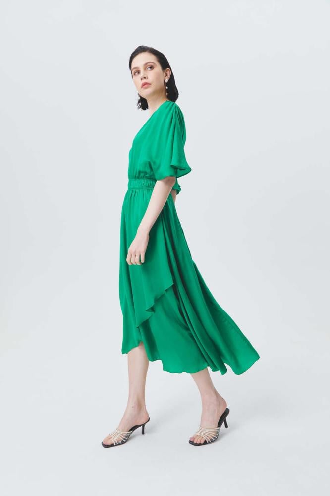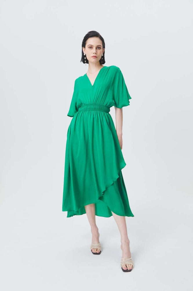 فستان أنيق بلون أخضر زاهي، يتميز بقصة واسعة مع أكمام فضفاضة لمظهر انسيابي مريح. يحدد الخصر بحزام مطاطي، بينما تمنحه الحواف غير المتساوية لمسة عصرية أنيقة.