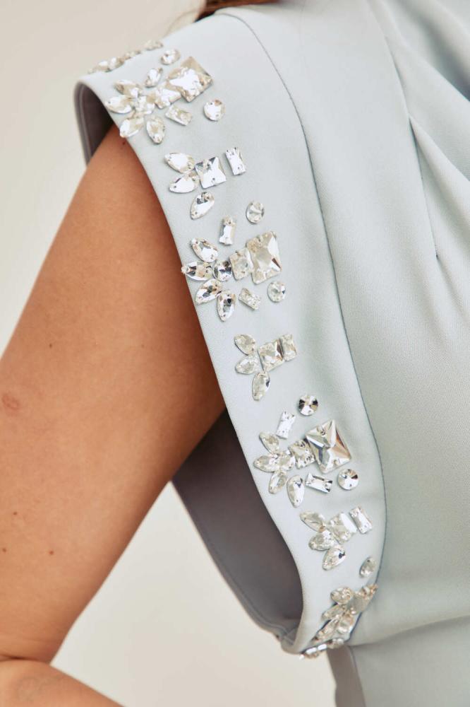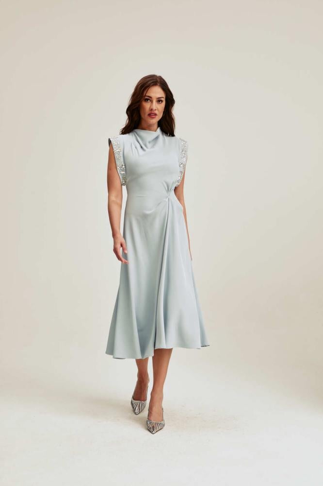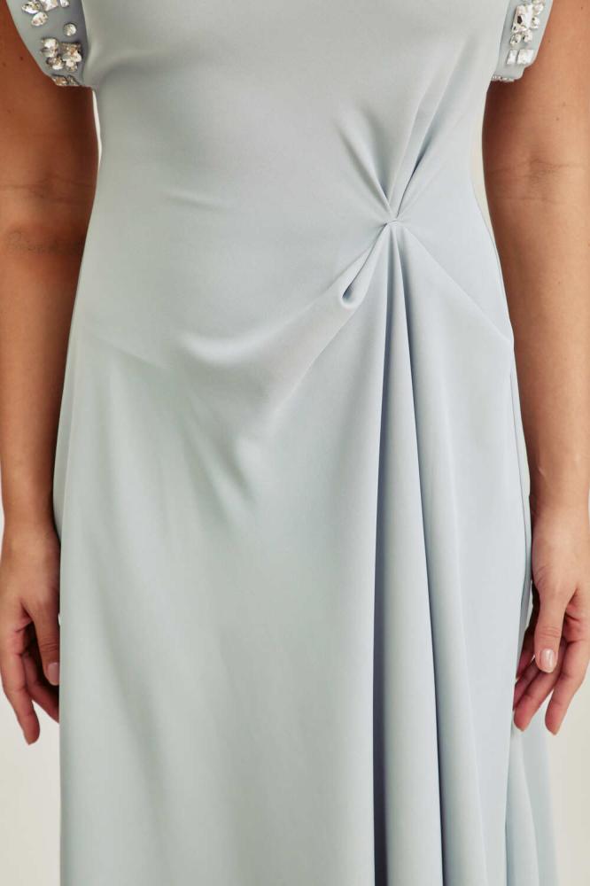 جاذبية هادئة! فستان سماوي بياقة مستديرة وأكمام قصيرة تزدان بأحجار براقة تضيف لمسة فاخرة. قصة A-Line ناعمة تتزين بعقدة جانبية تزيده أنوثة وتميز.