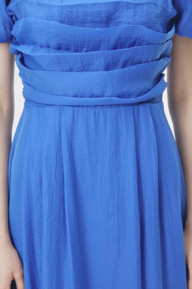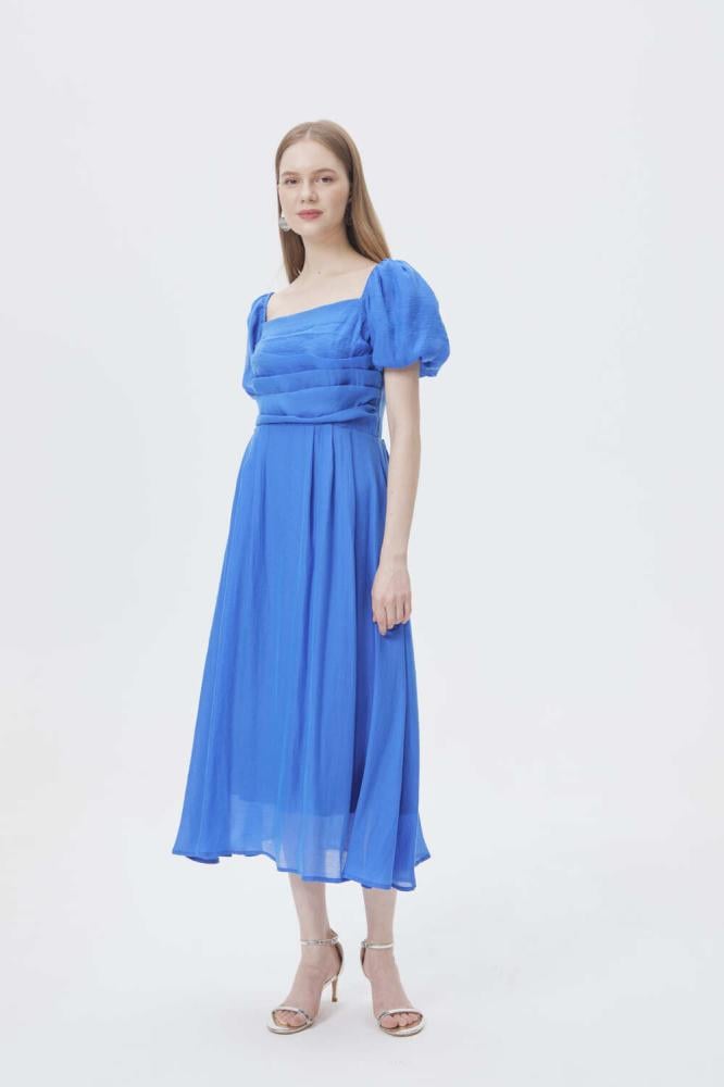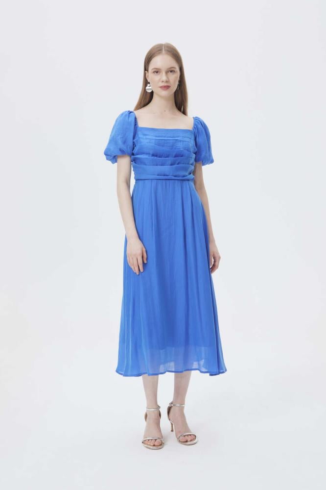An attractive, feminine, and elegant dress in an attractive color, featuring puffed sleeves and a square neckline, decorated with pleats at the top, and an A-line cut.