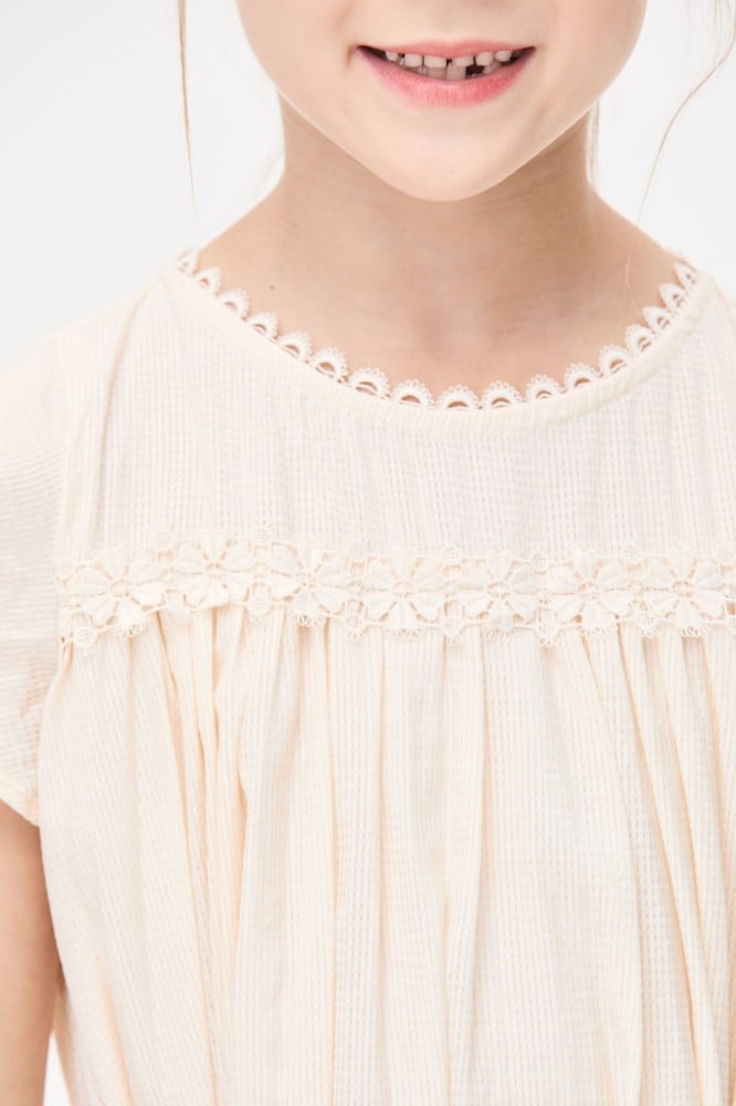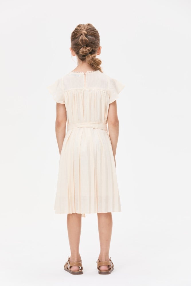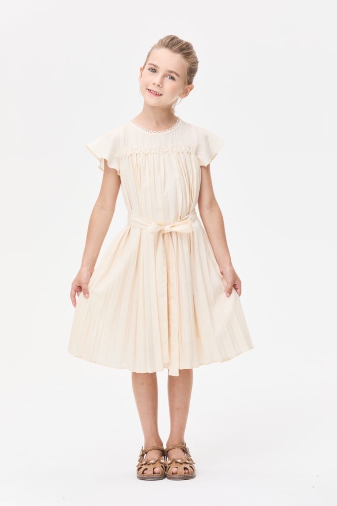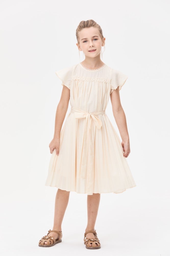 اختاري لصغيرتك هذا الفستان الرائع لإطلالة أنيقة، مصمم بياقة مستديرة وبأكمام قصيرة ويتميز بقصة واسعة بتفاصيل كسرات ويأتي مع حزام ربط