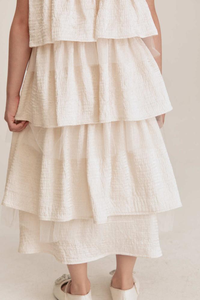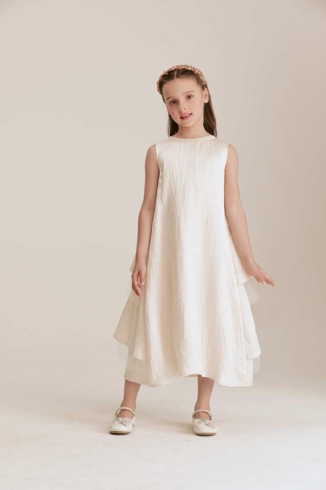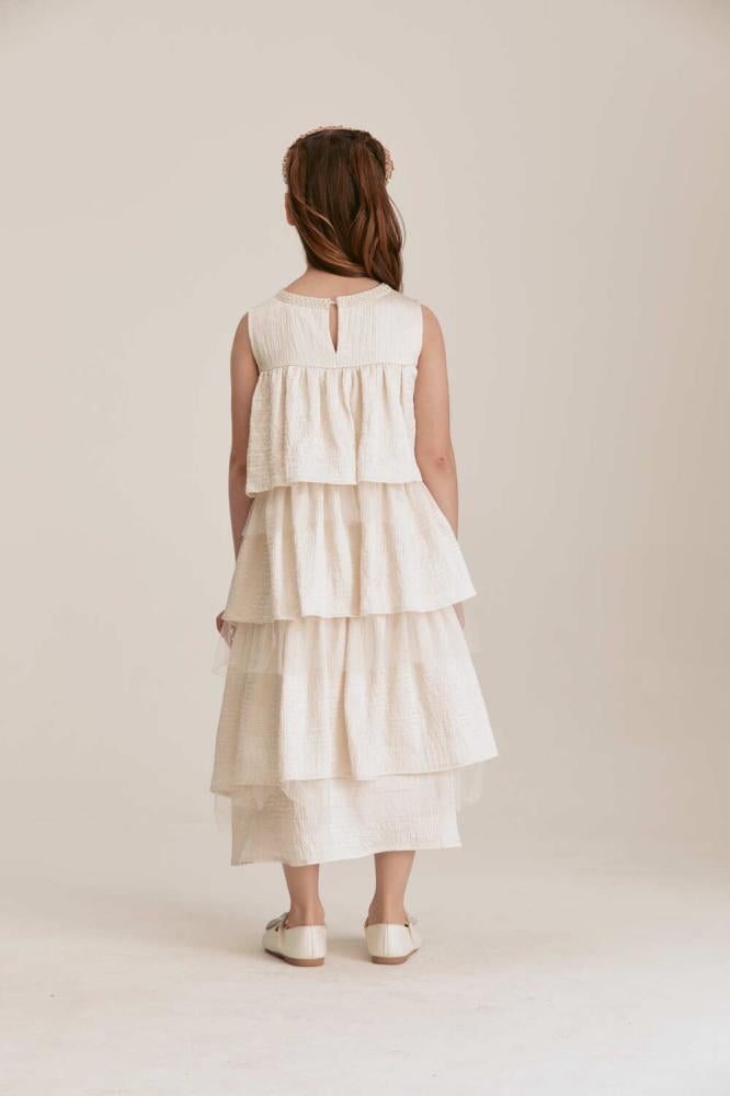 أضيفي لمسة مفعمة بالراحة والأناقة إلى خزانة ملابس صغيرتك وانتقي فستان بقصة واسعة يتميز بطبقات كشكش من الخلف