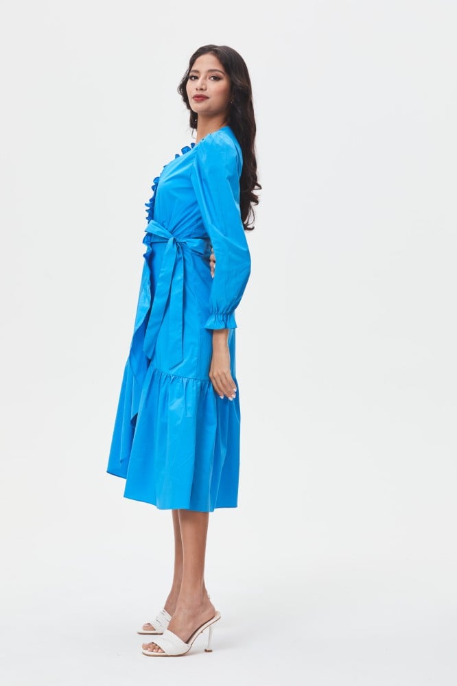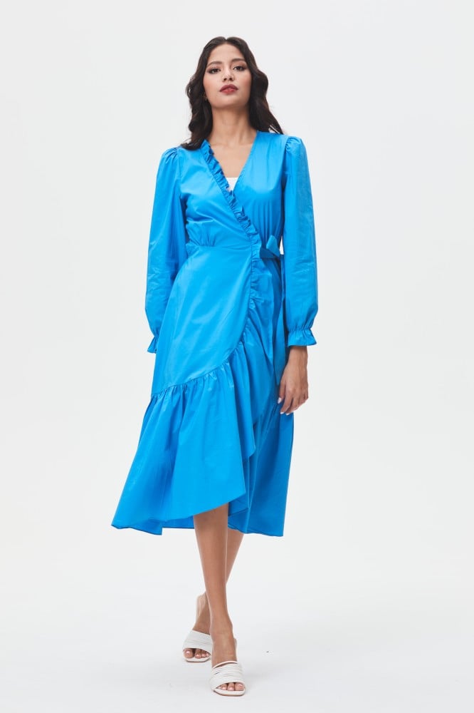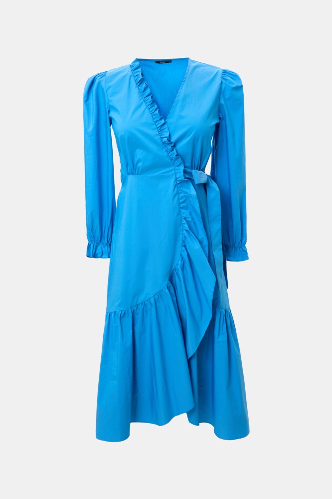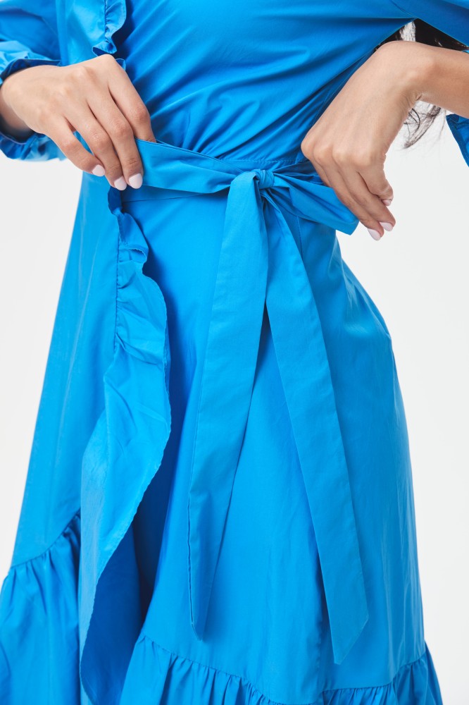 For a feminine and elegant summer look in a cheerful color, choose a wrap dress with a deep V-neck, long sleeves with elastic cuffs, and an attractive cut with a side tie.