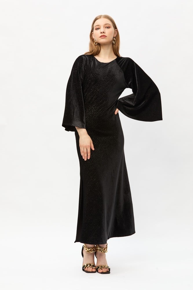 لإطلالة ساحرة وأنيقة ، فستان مخمل بتصميم ضيق بلون أسود بخامة بلمعة مصمم بقصة ضيقة تبرز جمال قوامك ويتميز بفتحة رقبة مستديرة وبأكمام واسعة ويزدان بفتحه جانبية