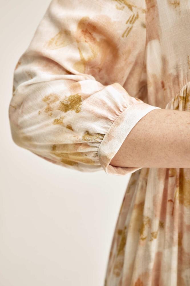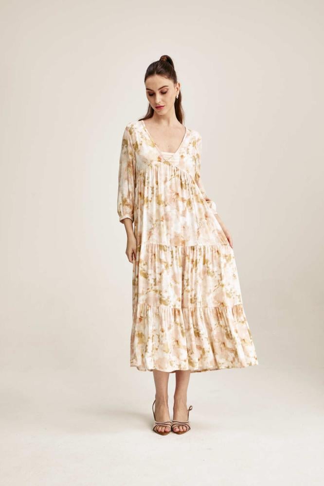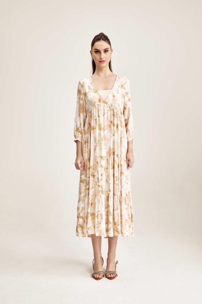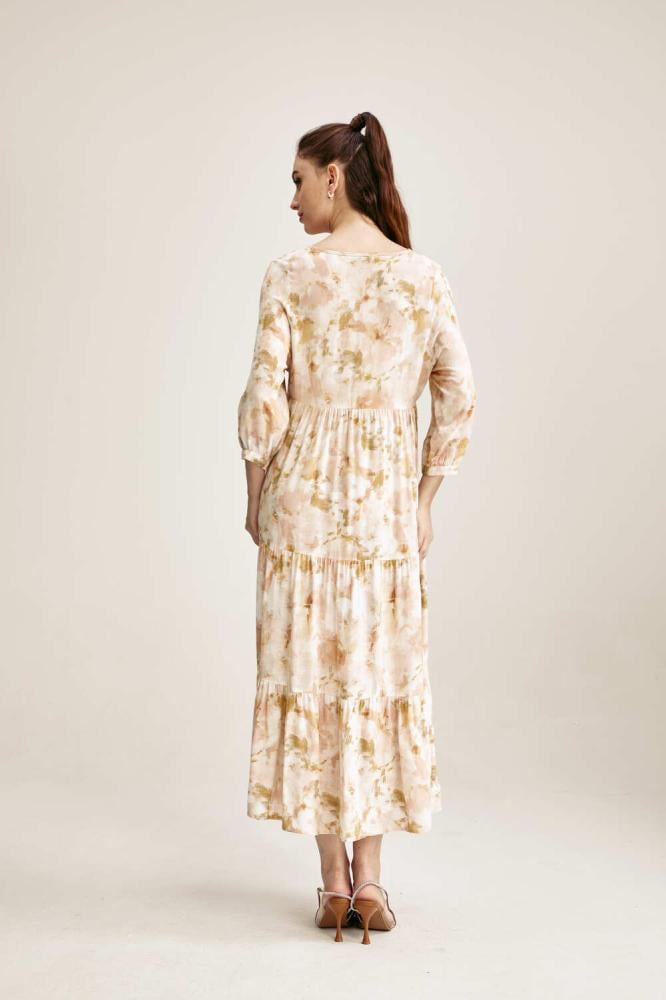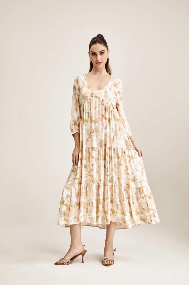 بتصميم بياقة على شكلV وأكمام متوسطة الطول ويأتي بقصة طبقات بتفاصيل طيات