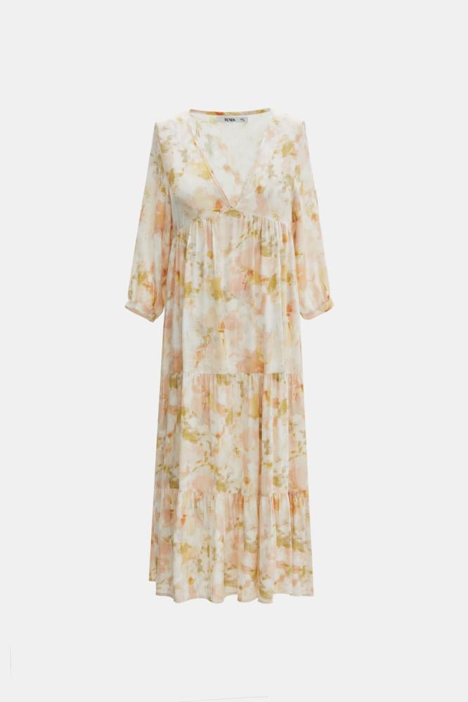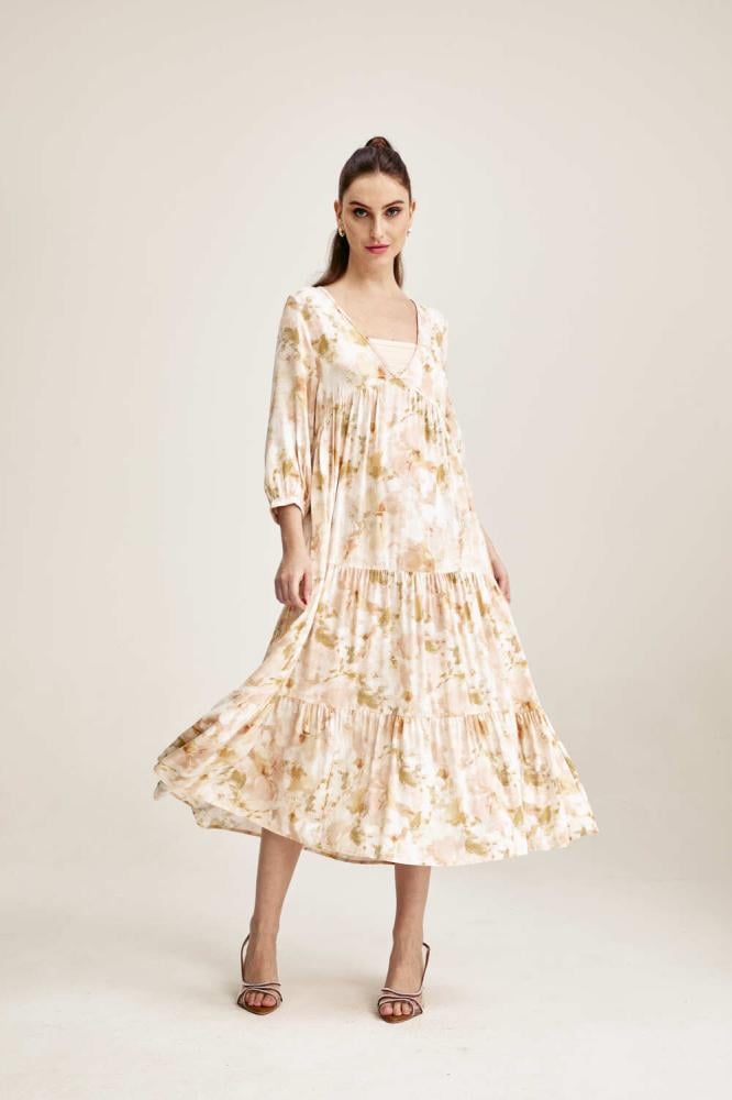 فستان بطبعة زهور نابضة بالحياة، يجمع بين النعومة والراحة بقصة فضفاضة وانسيابية.