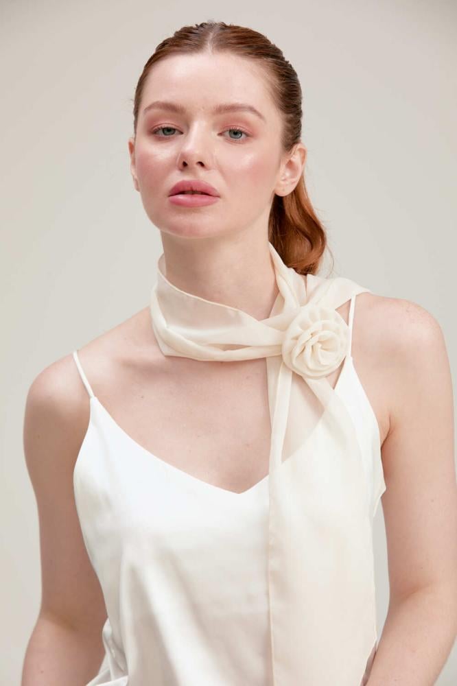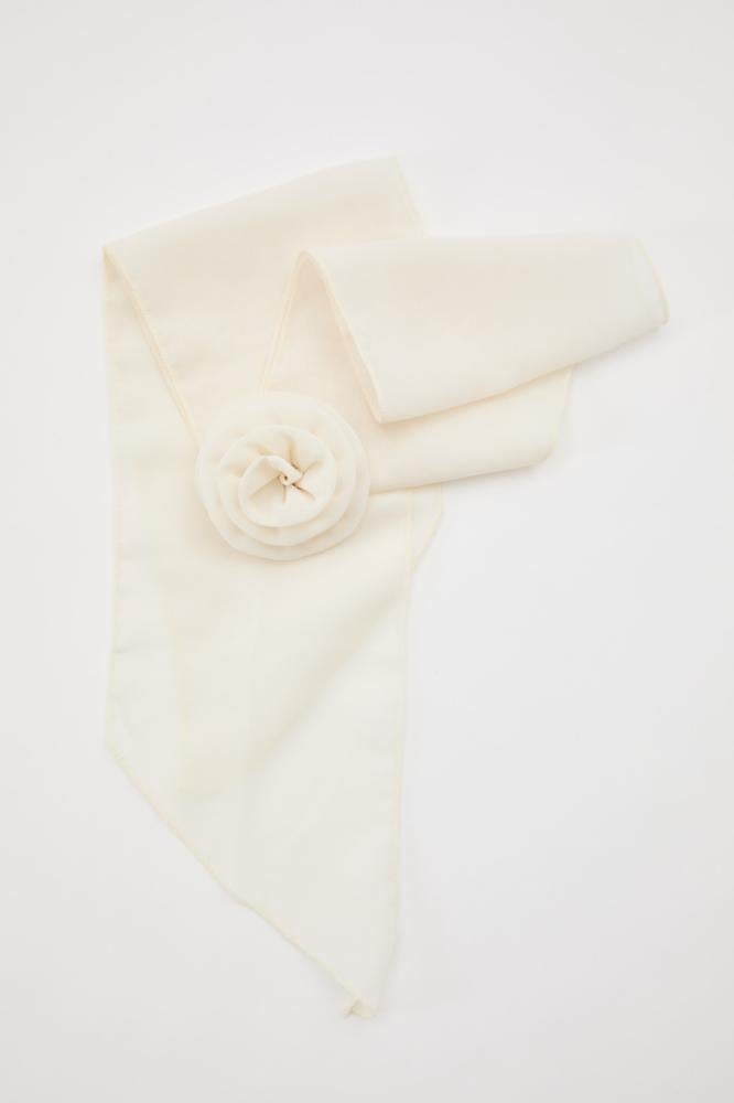 سيضفي هذا الوشاح لمسة أنثوية أنيقة على إطلالتك، بتصميم منسدل مزين ببروش على شكل وردة رمز المنشأ : SF25484 رمز خاص : 25SS11ACC